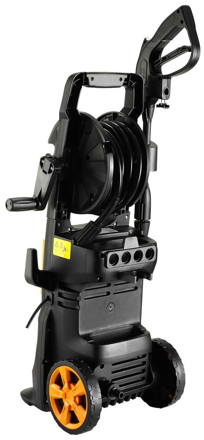 8-метровый шланг – ключевое преимущество модели: он позволяет мыть легковой автомобиль или мотоцикл без перемещения мойки. Однако шланг жёсткий и склонен к перегибам (риск заломов), а для сматывания на катушку требуется снимать насадку с пистолета. Некоторые пользователи заменяют его на более мягкий аналог. -