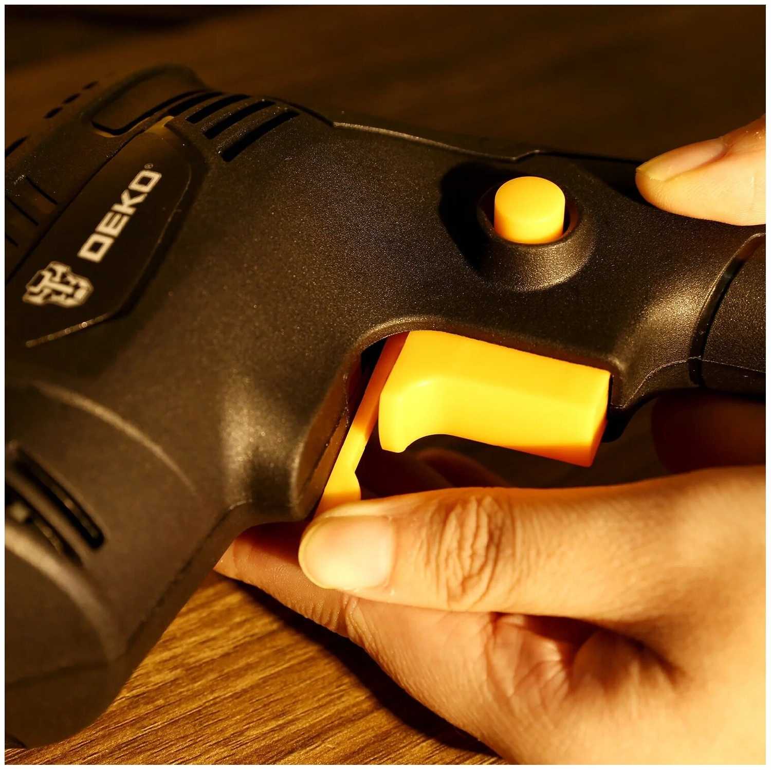 - Кнопка фиксации выключателя упрощает продолжительную работу (например, при сборке стеллажей).