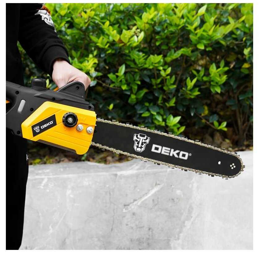 Шина крепится на один «болт», натяжка цепи странная, какая-то пластмассовая штуковина на пружинках. Старт плавный, перед левой рукой просто щиток, а не тормоз! Неизвестно, сколько прослужит болт, который фиксирует шину. Deko — это бюджетная техника, и у меня уже есть много чего от этой марки. Для дома и нечастых работ — самое то. Шурик Deko уже четвёртый год профессионально работает на потолках