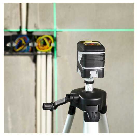 - Зелёный цвет луча ярче красного, чётко виден при дневном свете внутри комнаты, что упрощает выравнивание на расстоянии до 10 метров.