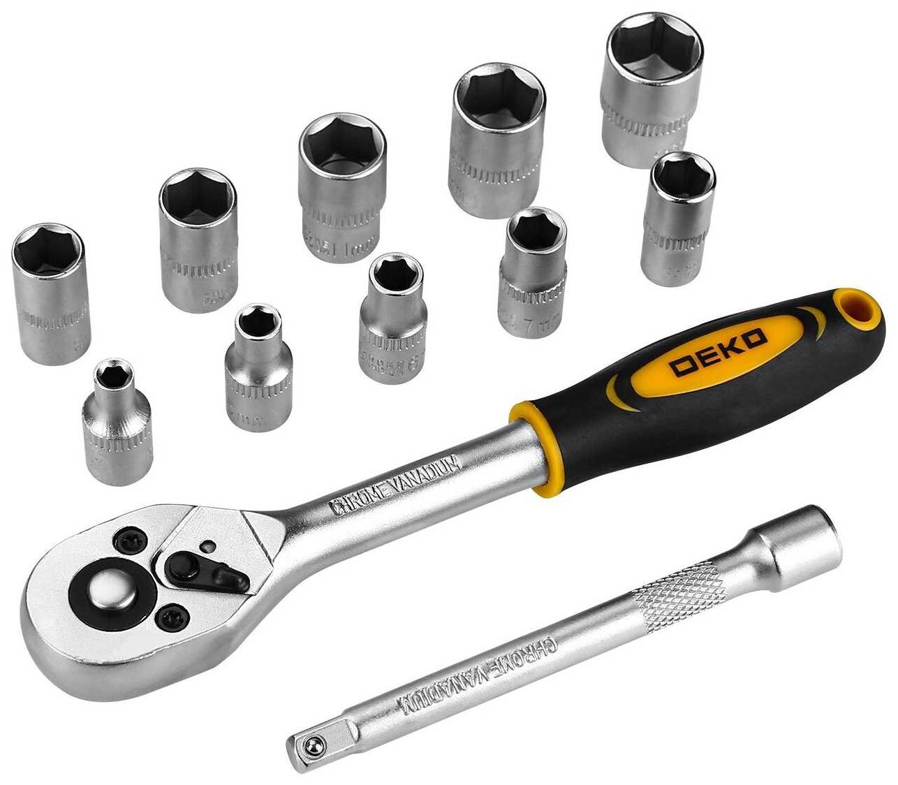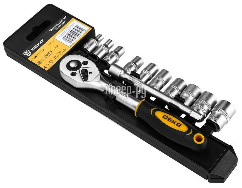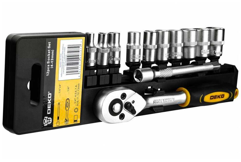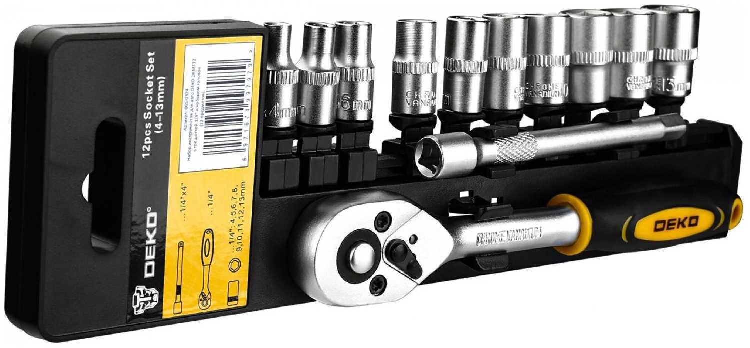Дополнительная информация : | Набор инструментов для авто DEKO DKMT12 с трещоткой 1/4" и набором головок (12 предметов) предназначен для ремонта автомобилей. Инструменты набора изготовлены из высококачественной хромованадиевой стали с хромированным покрытием. Комплектация: 1 шт трещотка 1/4", 10 шт головки 1/4": 4 5 6 7 8 9 10 11 12 13 мм, 1шт удлинитель 1/4"x4". |