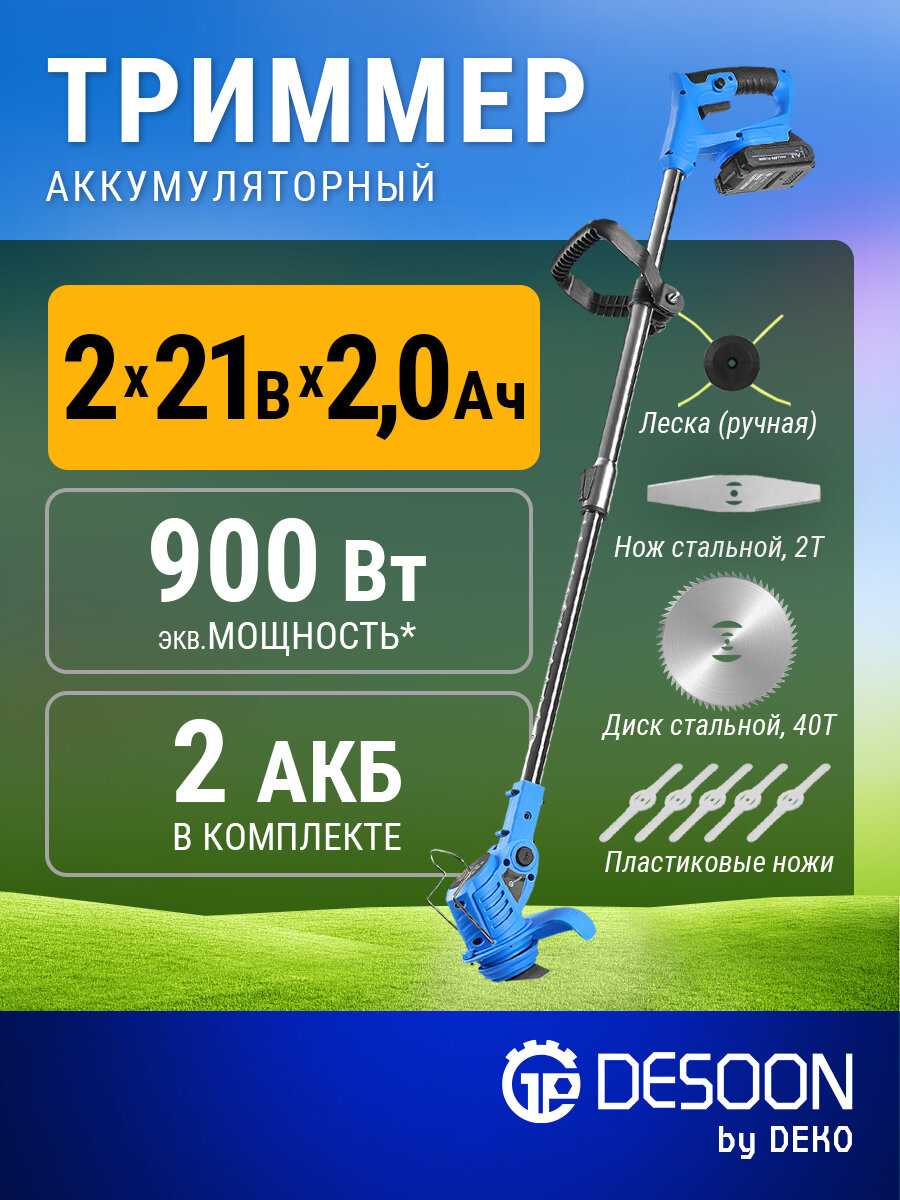 - + Хороший триммер. Траву стрижет хорошо. Легкий. К нему подходят аккумуляторы от другой техники Deko.