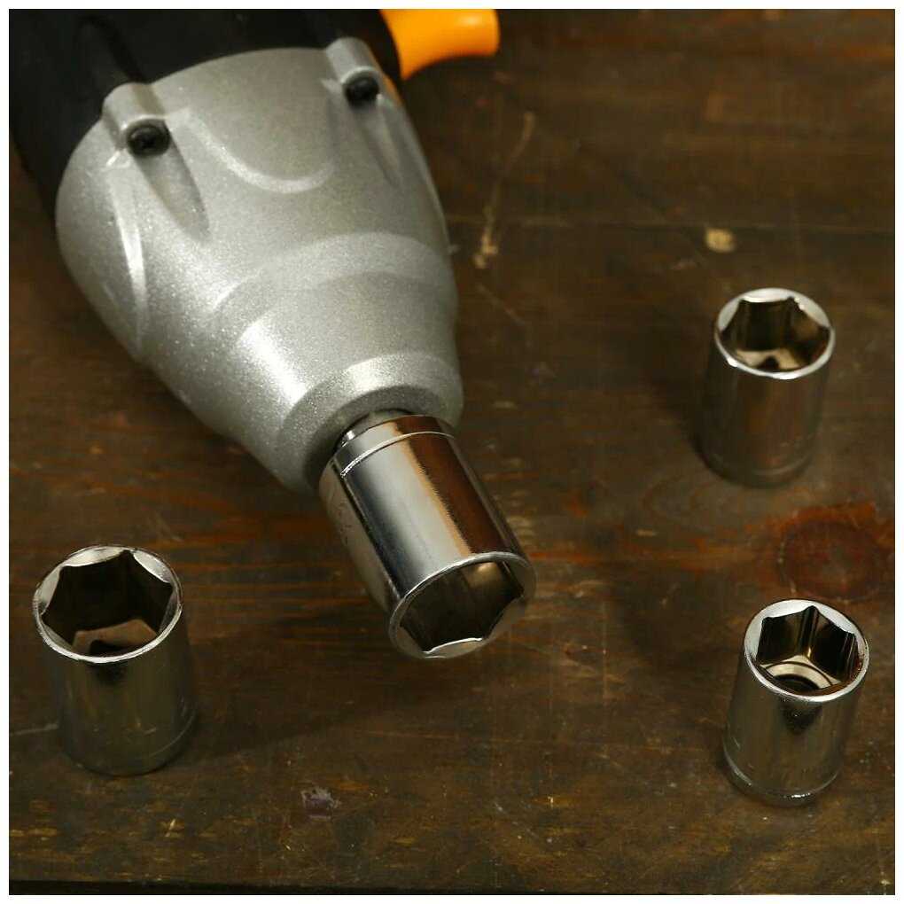 В комплекте 4 ударные головки на 17, 19, 21 и 22 мм, что покрывает большинство колесных гаек. Пользователи хвалят наличие этих насадок сразу. Можно использовать с дополнительными переходниками. Это большой плюс для старта работы без допокупок.