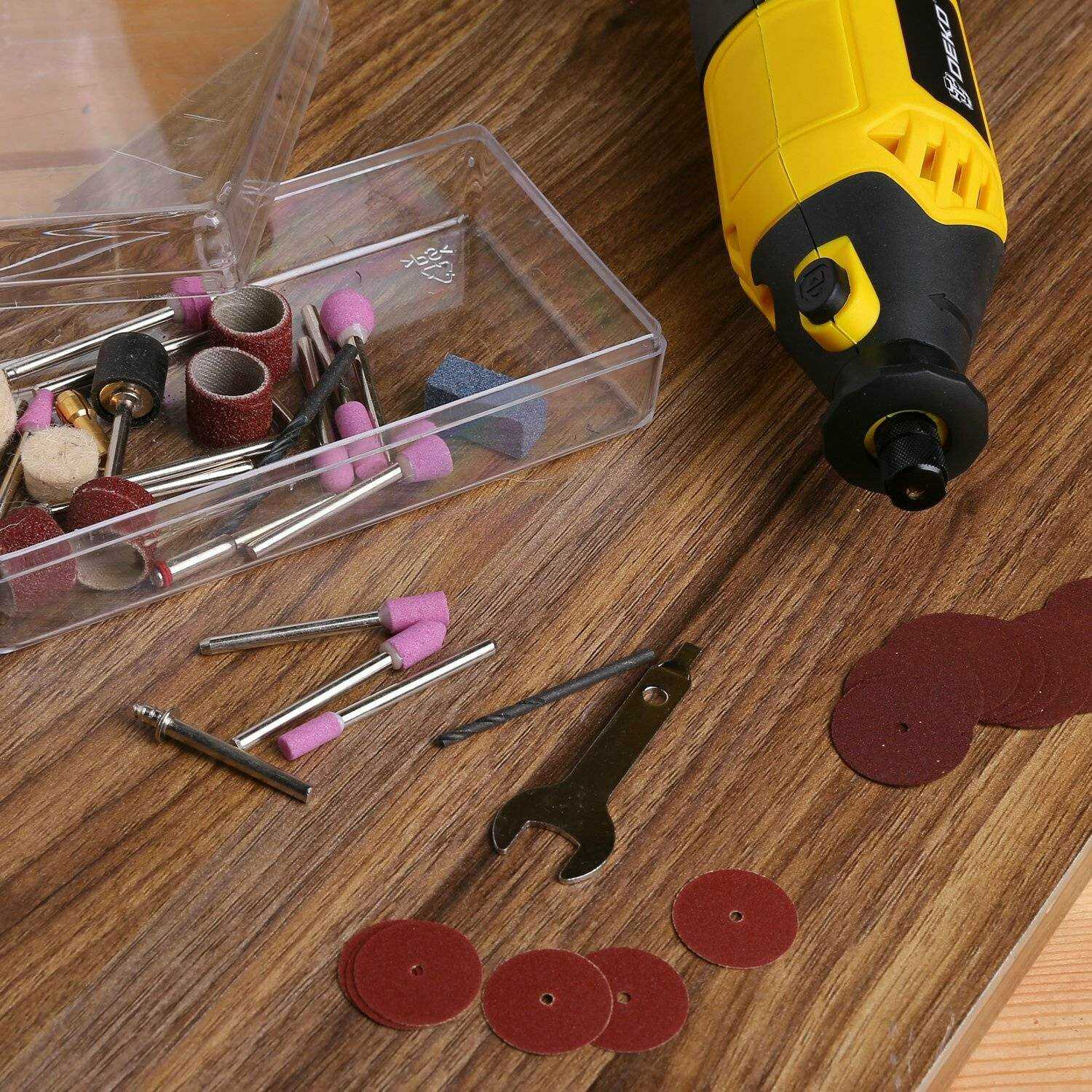 В набор входят отрезные диски, шлифовальные камни и базовые фрезы, но их качество среднее. Пользователи рекомендуют сразу докупать специализированные насадки (например, для гравировки по камню или работы с металлом), так как комплектные быстро изнашиваются.
