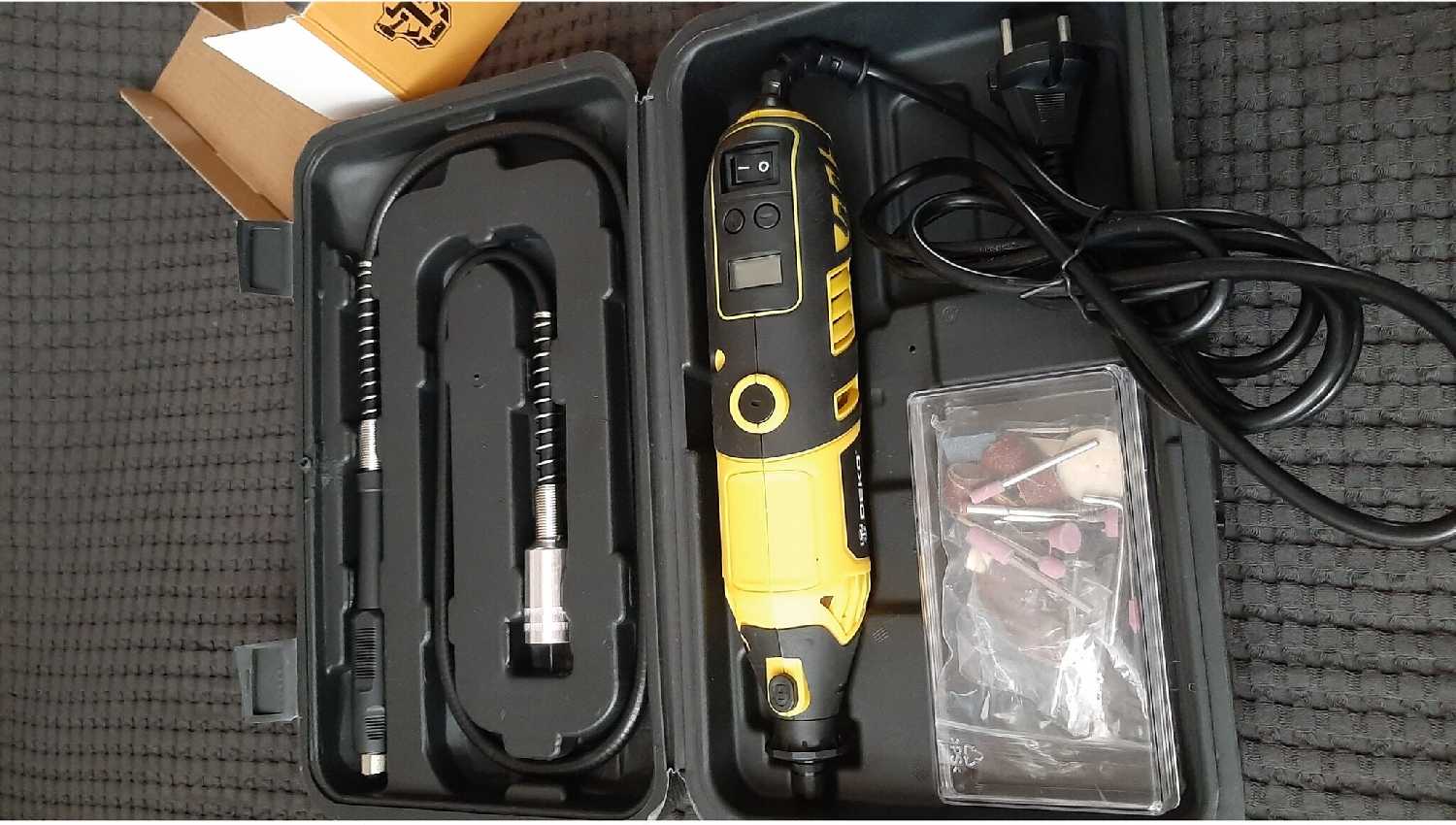 Достаточно мощный. Электронное табло с подсветкой и кнопочной регулировкой оборотов. Наличие минимального стартового набора в комплекте. Гибкий вал. Кейс.