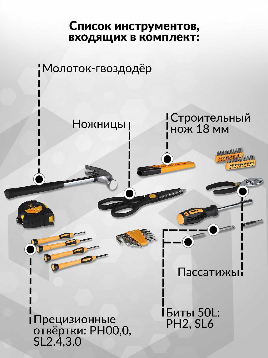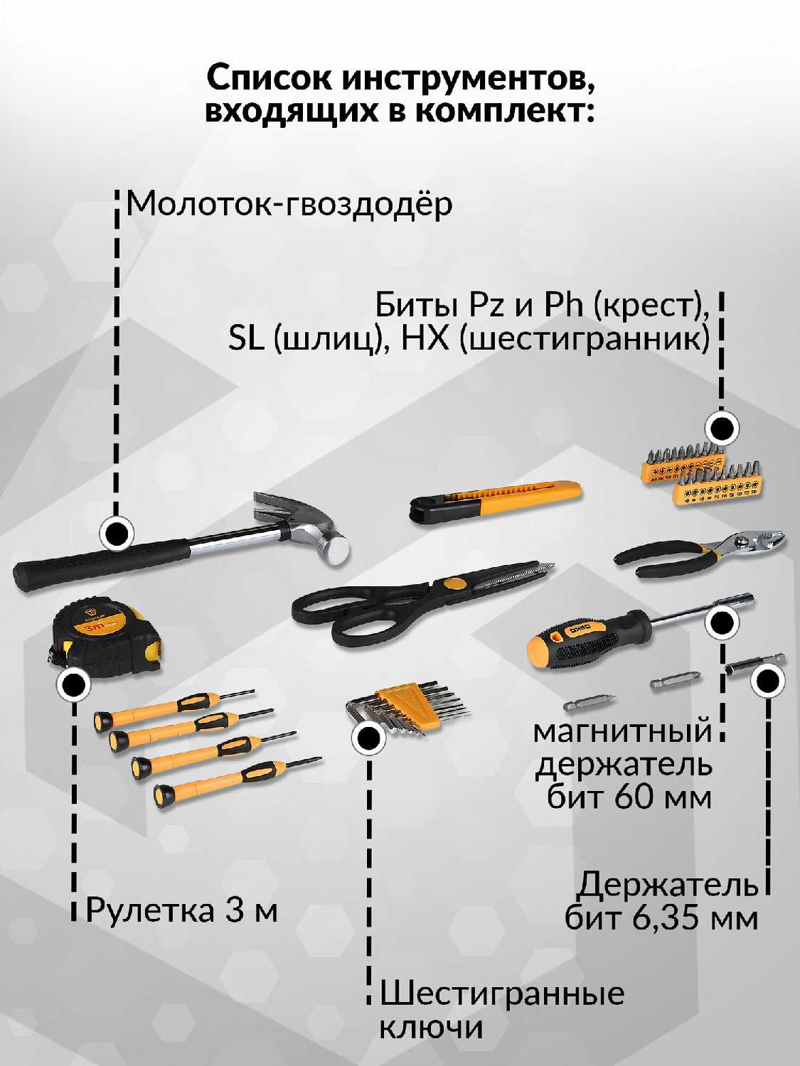 Инструменты в комплекте : | клещи, ключи имбусовые (шестигранные), молоток, ножовка по металлу, отвёртки, отвёртки для точных работ, плоскогубцы, рукоять для бит |