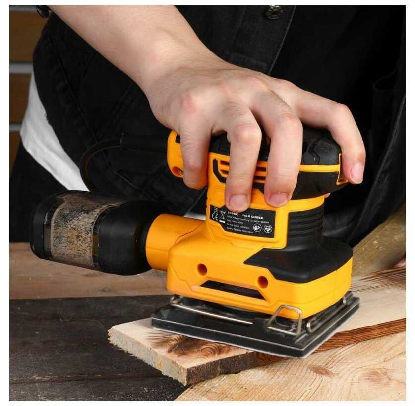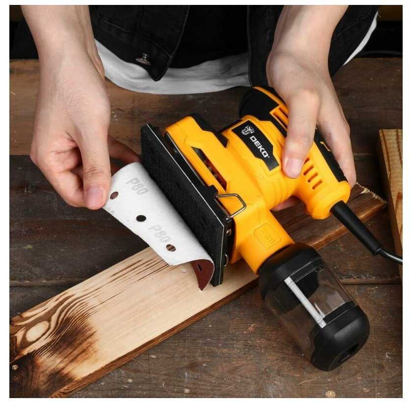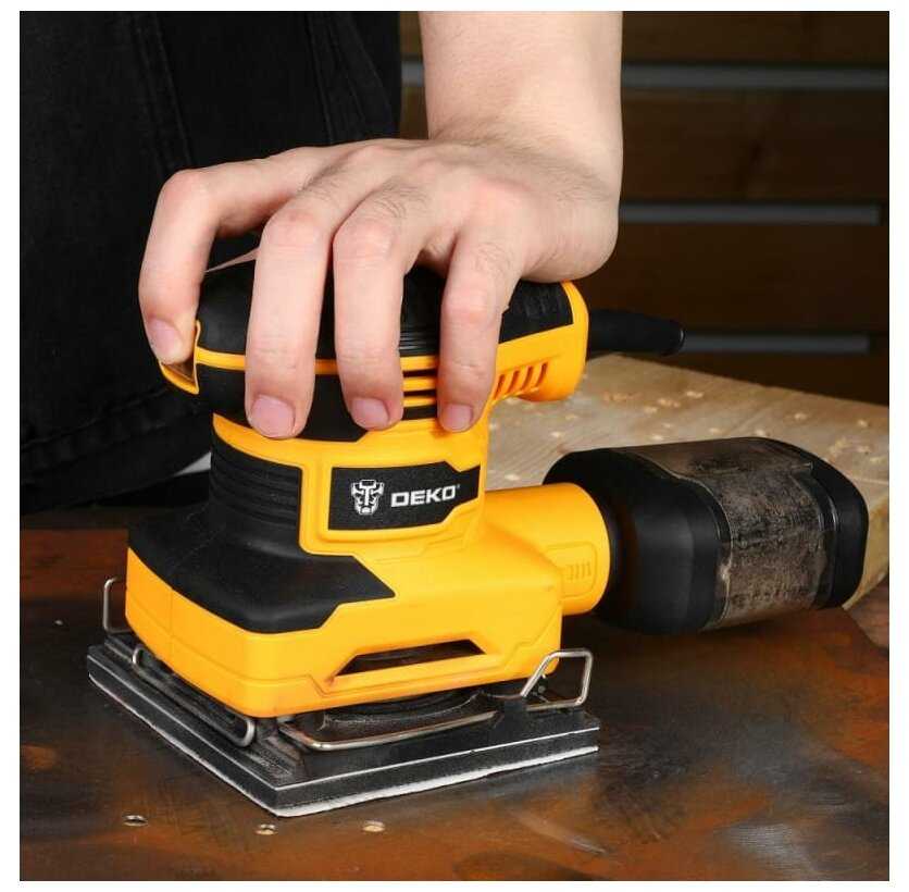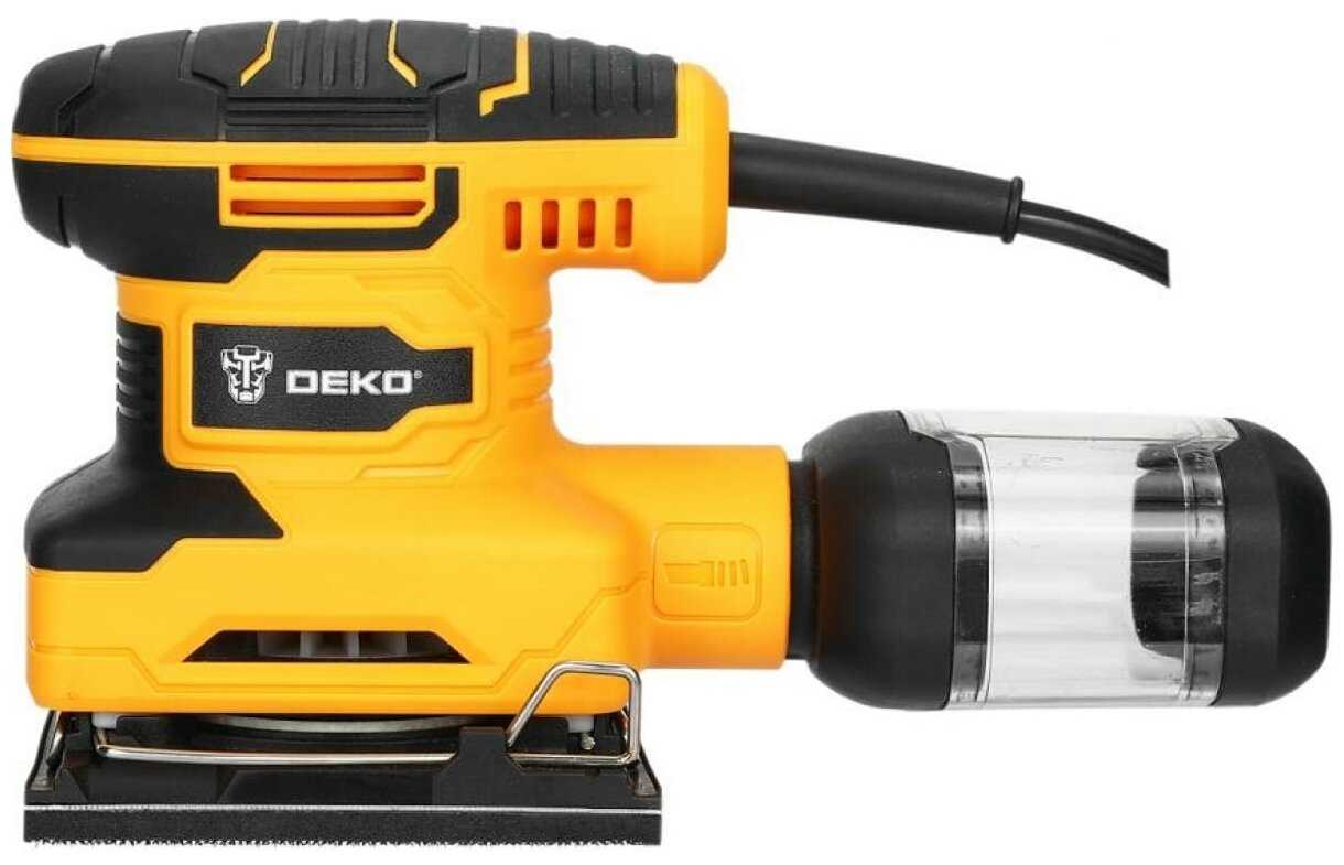 Дешевизна и мощность. DEKO отличная фирма соотношение минимальная цена при хорошем качестве. 400 ватт мощность, возможность работы одной рукой.Машинка для чистовой обработки с ходом 2мм соответственно требовать от нее работы на сдир не стоит.Для столярных работ самое то.ДНС тоже не накручивает цены