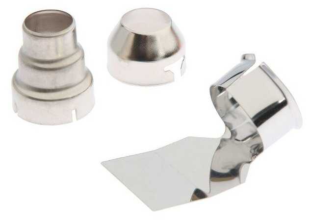 Комплектные насадки (особенно скребок для краски) деформируются под длительным воздействием температуры – в отзывах описывают случаи, когда они "скручивались в трубочку". Редукционные сопла часто обугливаются, а их фиксация ненадёжна: они крепятся без защёлок и могут спадать при работе. Для термоусадки лучше использовать отражатель, но его эффективность снижается из-за быстрого перегрева металлических элементов. -