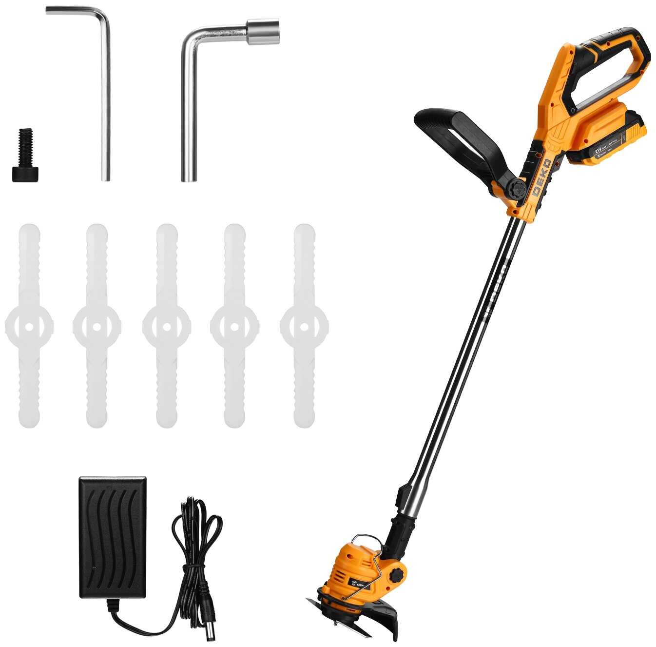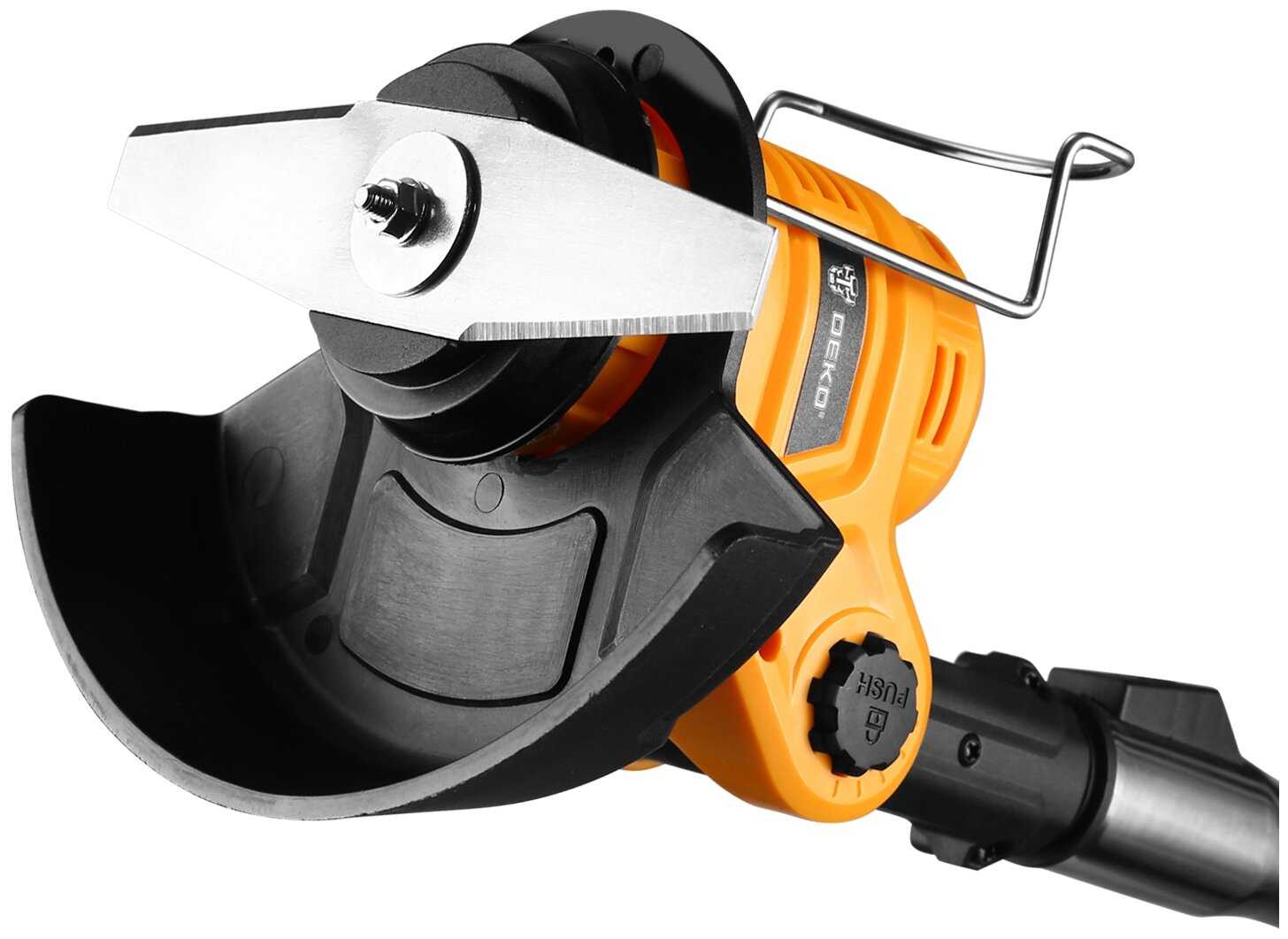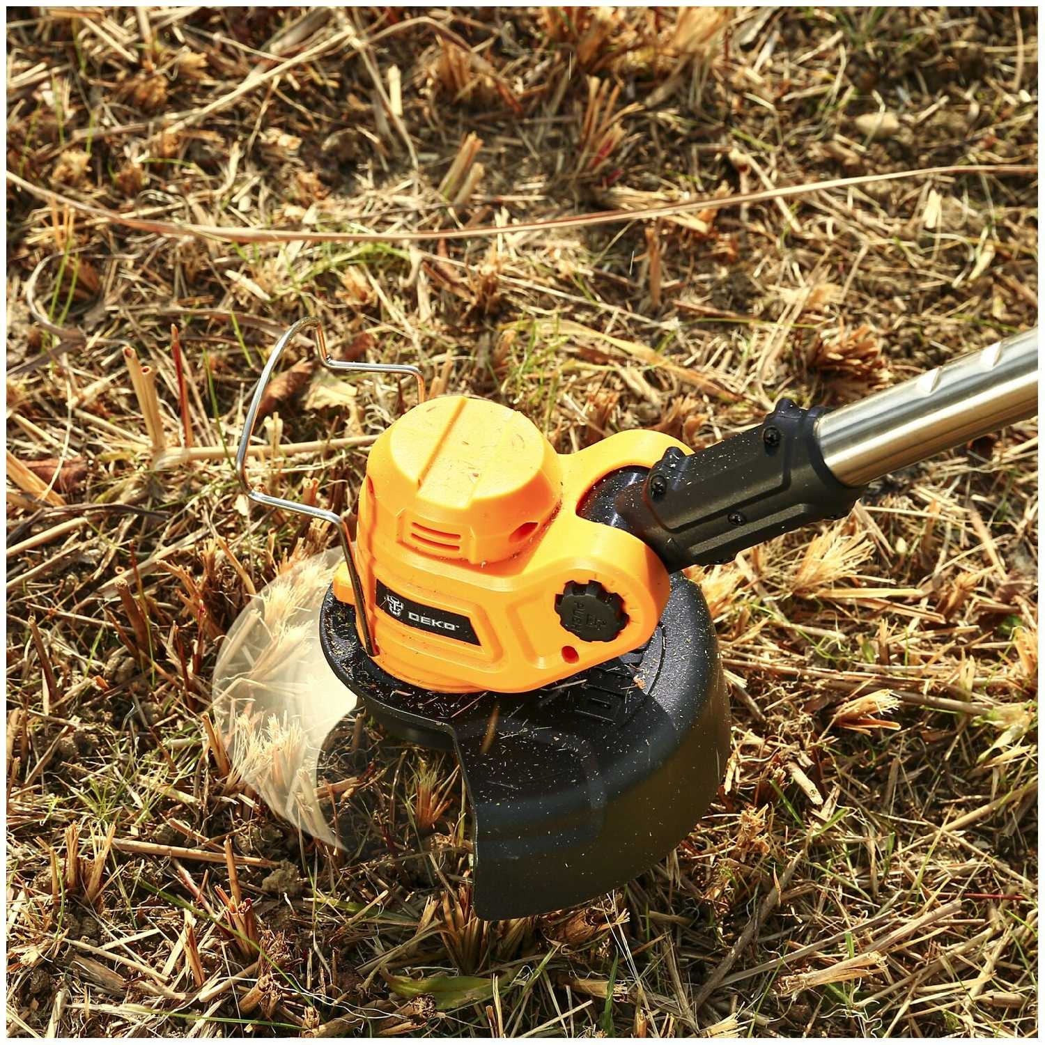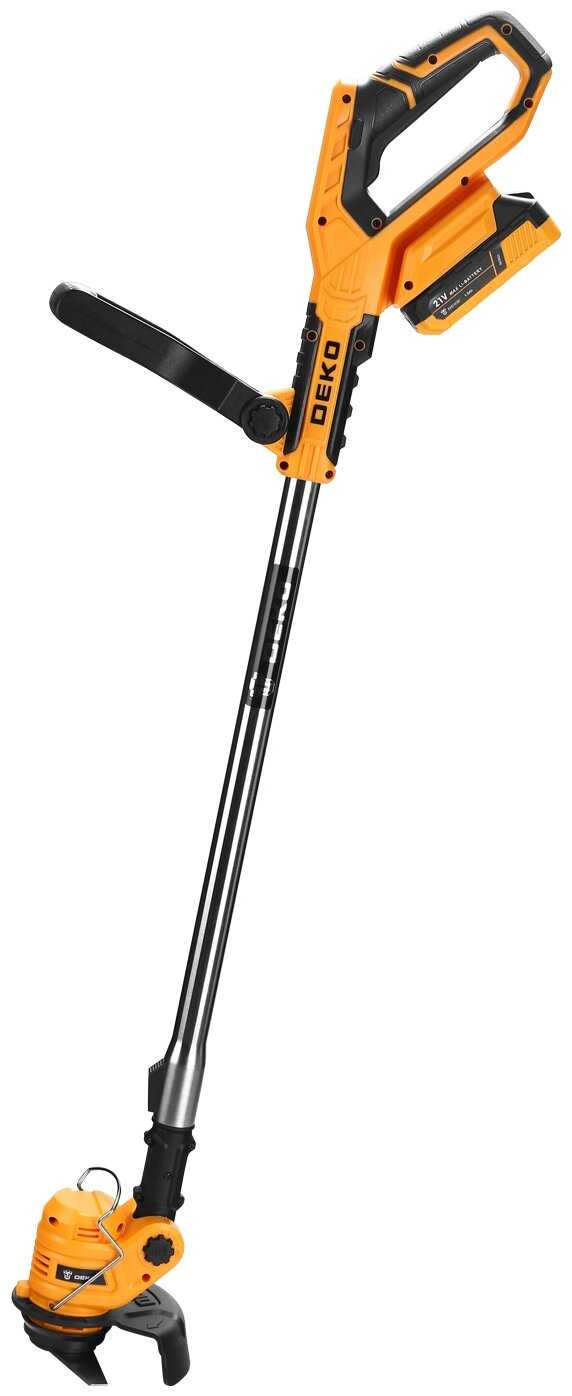 Полная ерунда, не рекомендую. Особенно этот Deko. Есть аккумуляторный триммер бош 18 В, совсем немного лучше, но у него недостаток быстрый перегрев аккумулятора, и долго ждешь, пока остынет, при этом даже заряжать не дает.