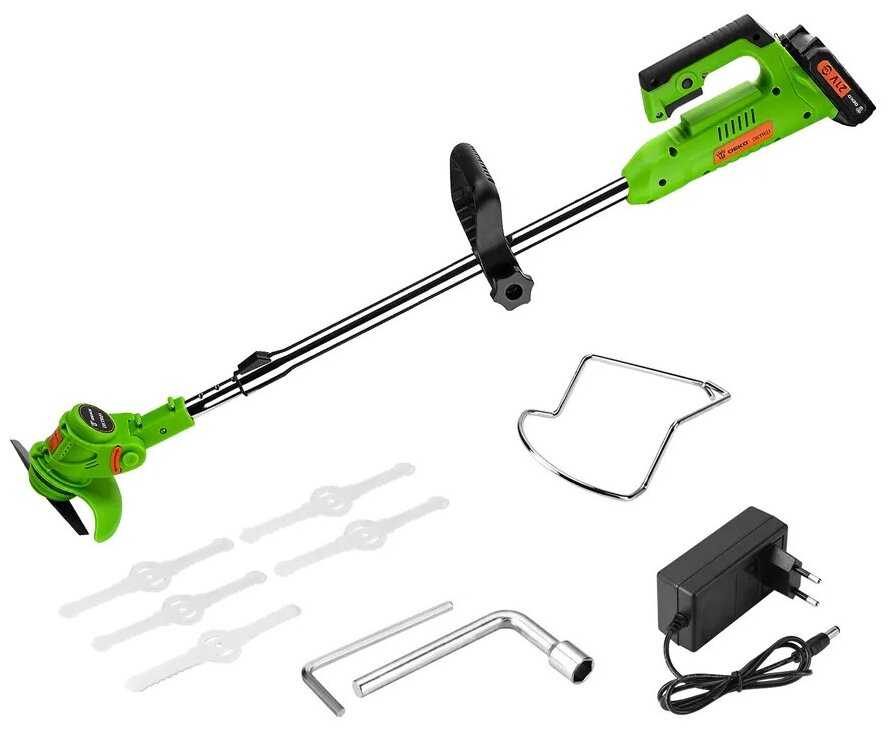 Двигатель очень слабый. Насадки которые в комплекте должным образом не работают. Переставил ручку с аккумулятором на другой триммер. Металлические вставки на головке под леску , вылетают сразу. Советую использовать с одним усиком лески. К покупке не советую.
