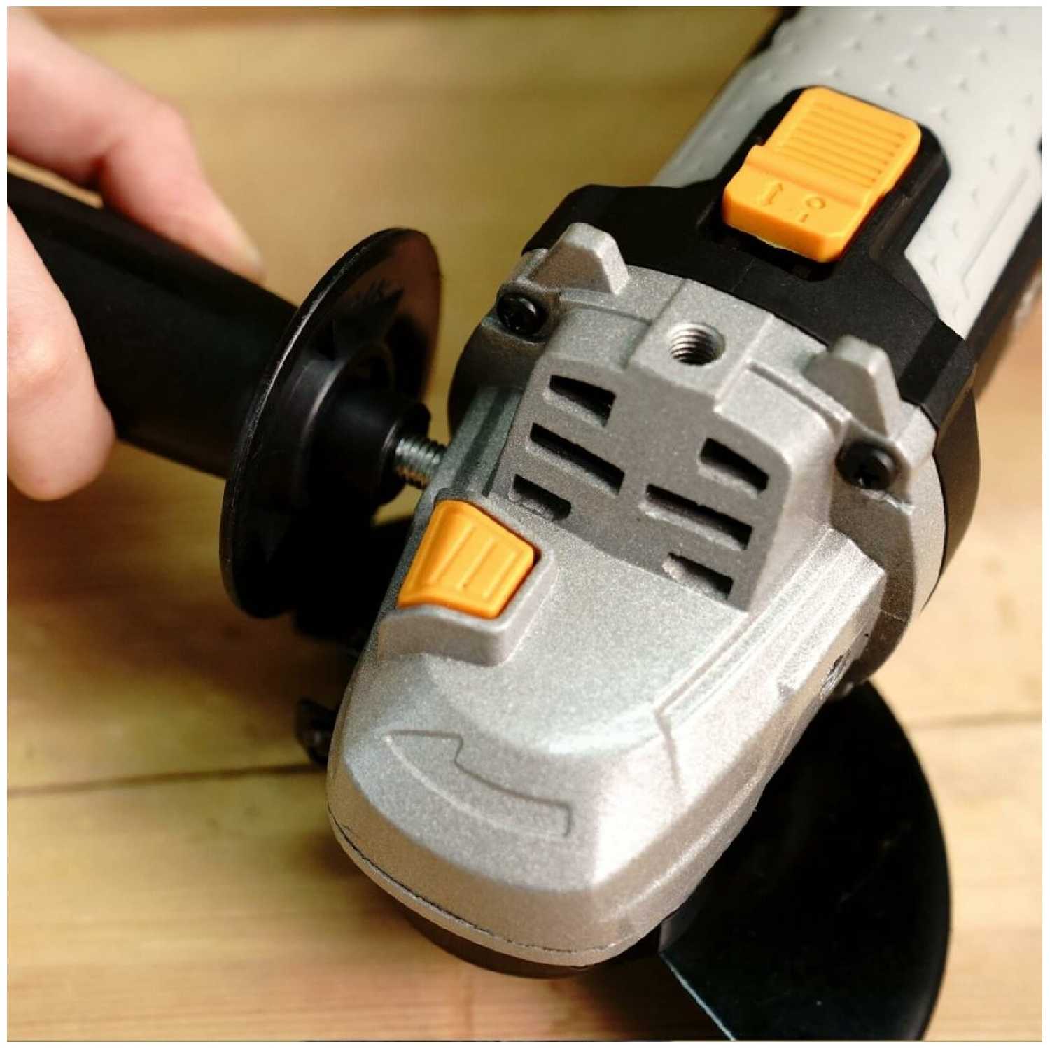 Эргономика и удобство эксплуатации: Эргономика инструмента получила неоднозначные оценки, где основные преимущества соседствуют с серьезными недостатками. К явным плюсам пользователи относят компактный и неширокий корпус с прорезиненными противоскользящими вставками, что обеспечивает уверенный и удобный хват как одной, так и двумя руками. Легкий вес (порядка 1,5–1,7 кг) снижает усталость оператора при кратковременных операциях. Трехпозиционная дополнительная рукоятка легко переустанавливается для работы под разными углами и обеспечивает хороший контроль над инструментом. Главным минусом эргономики единогласно признано крайне неудачное расположение кнопки включения/блокировки на боковой части корпуса. Для ее активации часто требуется менять хват и проворачивать инструмент в руке, что небезопасно и неудобно, особенно в условиях интенсивной работы с частыми пусками и остановками. Сама кнопка описывается как «туговатая». Защитный кожух совместим с дисками диаметром 125 мм, несмотря на то что в некоторых описаниях заявлен только 115 мм. Резьба шпинделя стандартная M14, что обеспечивает совместимость с большинством оснастки. Шнур электропитания короткий (около 1,8 метра) и жесткий, особенно на холоде, что вынуждает многих пользователей immediately заменить его на более длинный и гибкий.