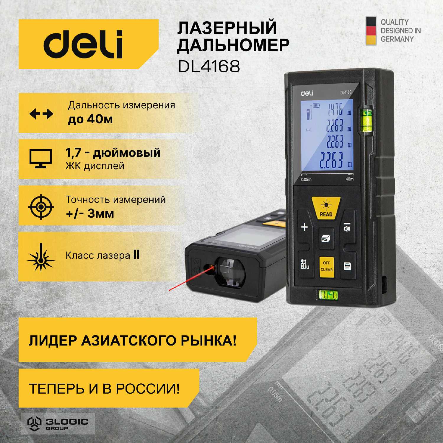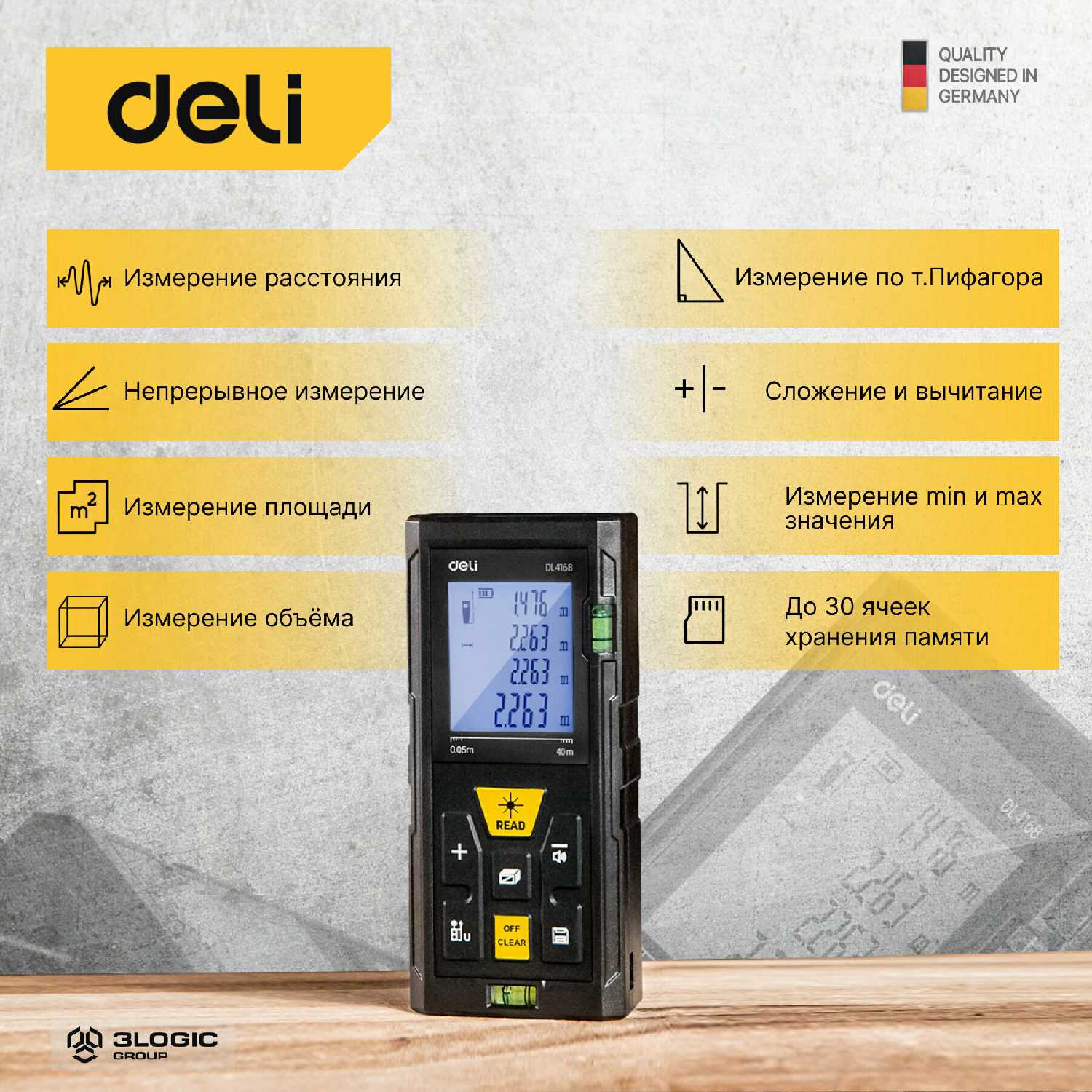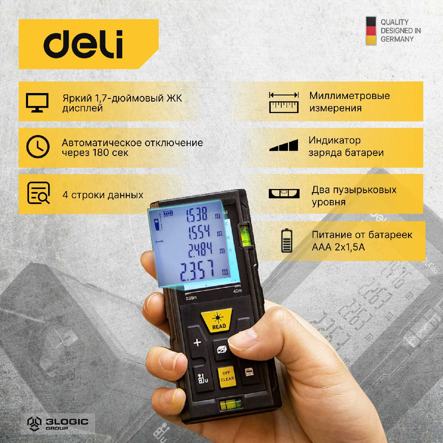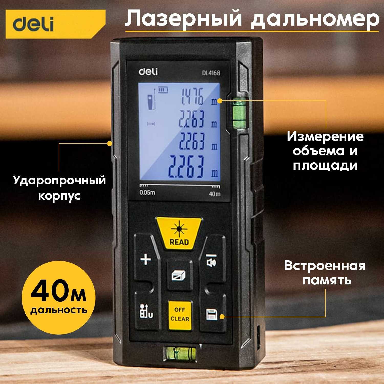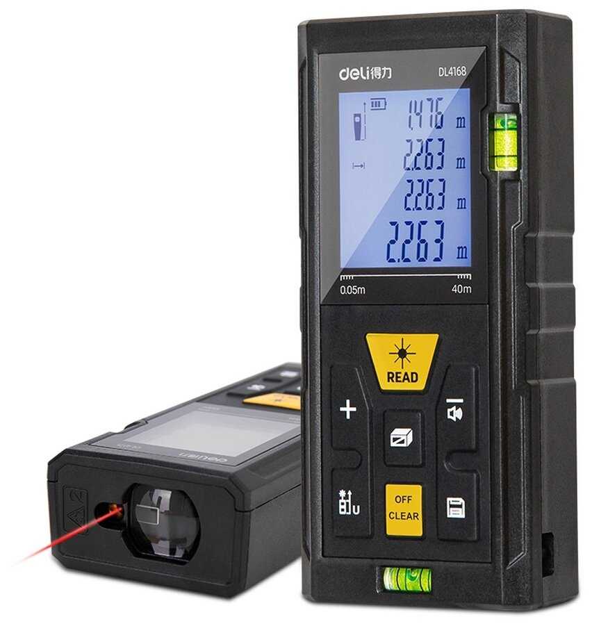 - + Очень хороший инструмент, сравнивал с дальномером Bosch, погрешность на 10 метров у Deli лишь 2 мм , считаю это вообще не критично. Он исправно измеряет длину, ширину, высоту, и есть режим подсчета, какой смысл переплачивать если он отлично это все делает и по бюджетной цене. В комплекте шнурок и чехол.
