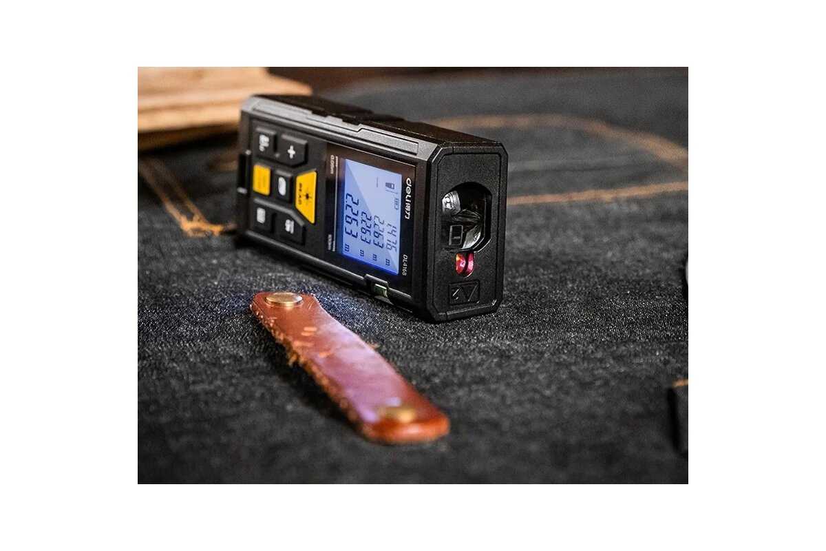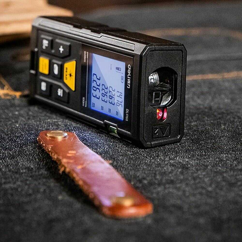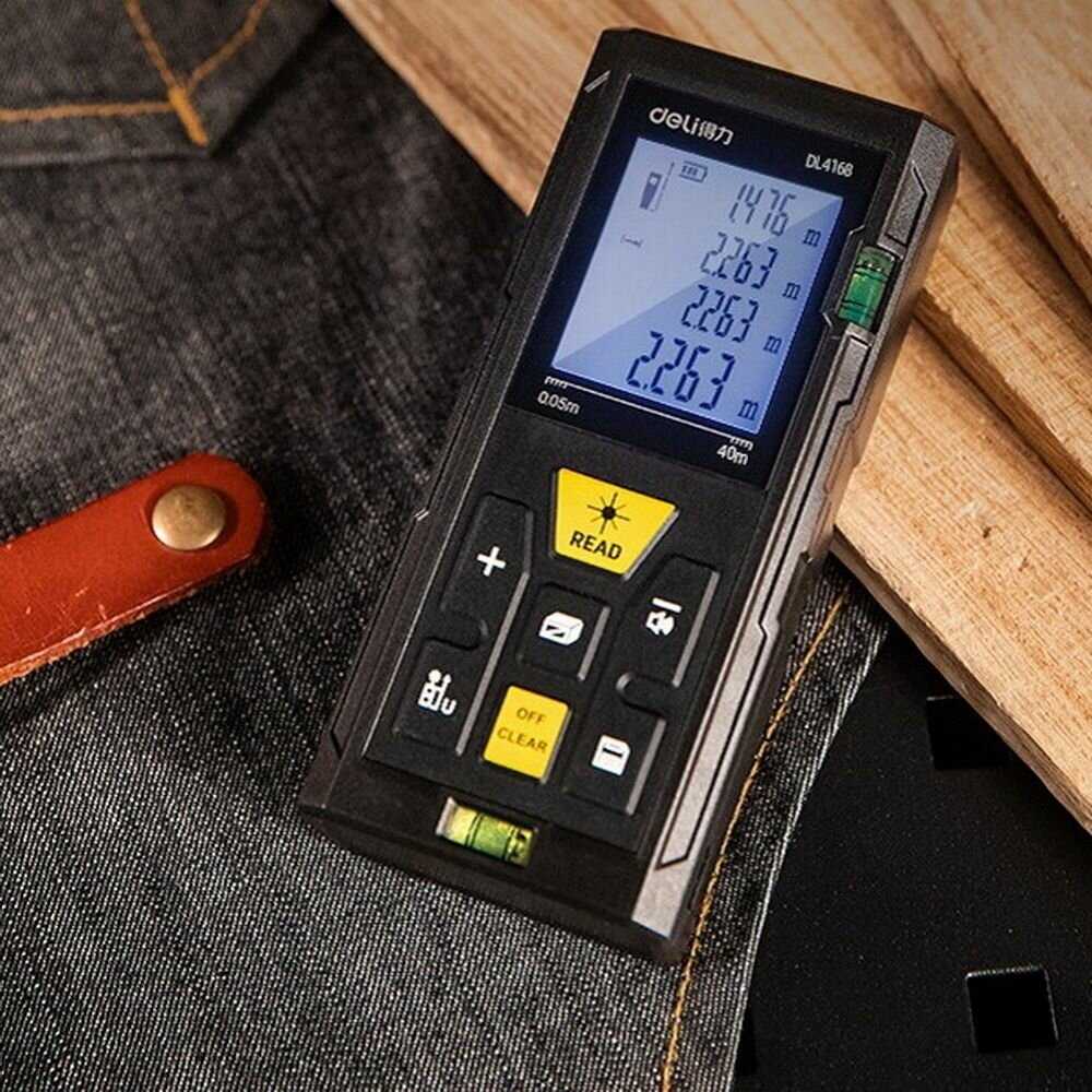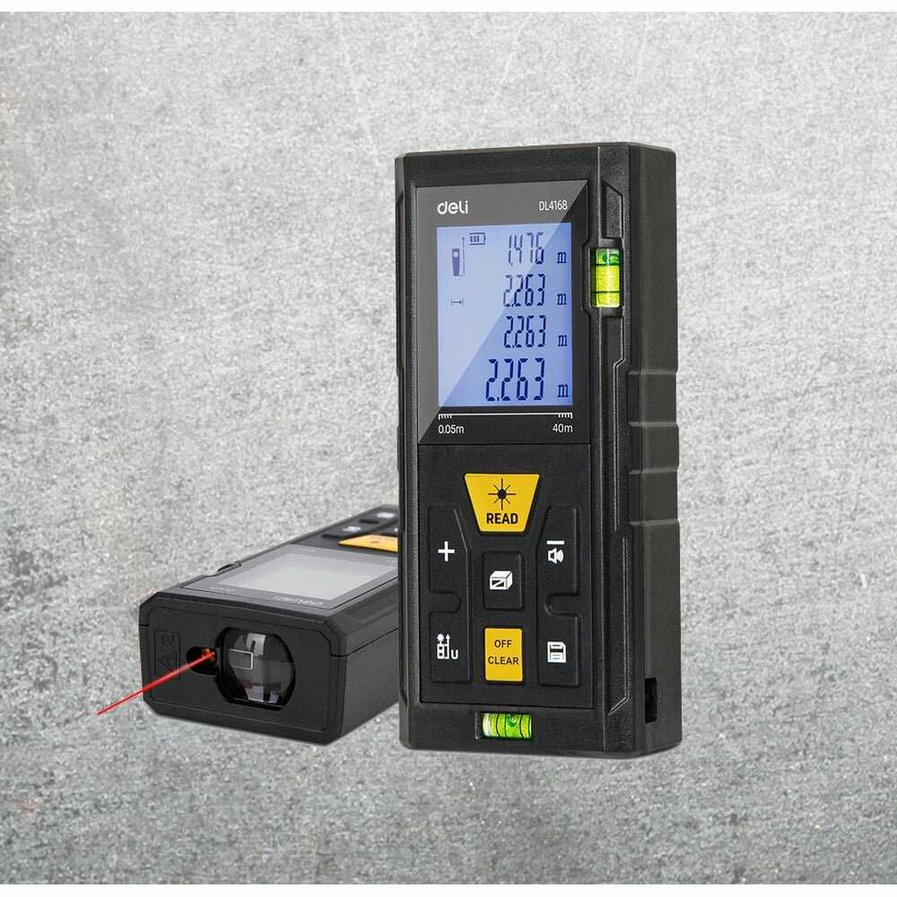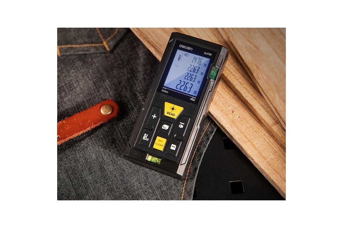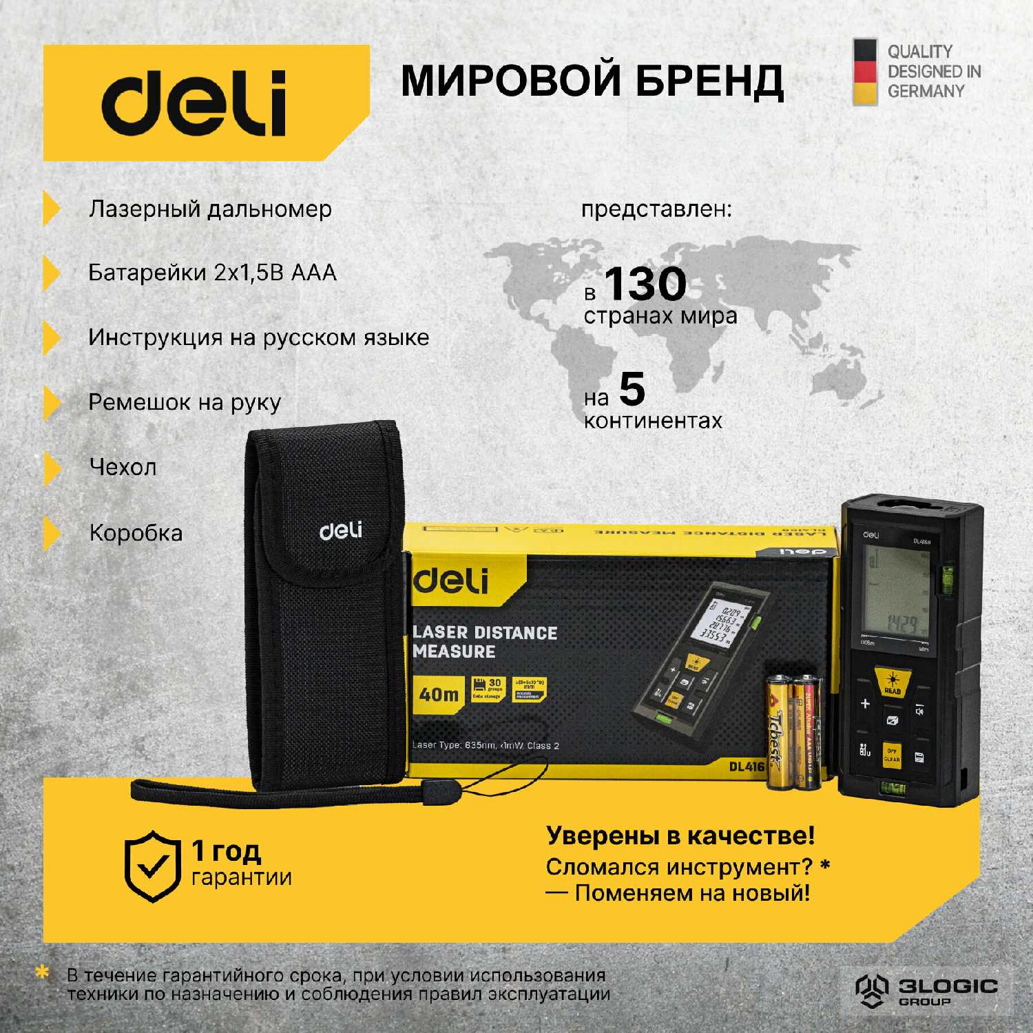 - + Очень хороший инструмент, сравнивал с дальномером Bosch, погрешность на 10 метров у Deli лишь 2 мм , считаю это вообще не критично. Он исправно измеряет длину, ширину, высоту, и есть режим подсчета, какой смысл переплачивать если он отлично это все делает и по бюджетной цене. В комплекте шнурок и чехол.
