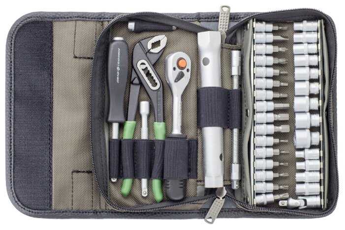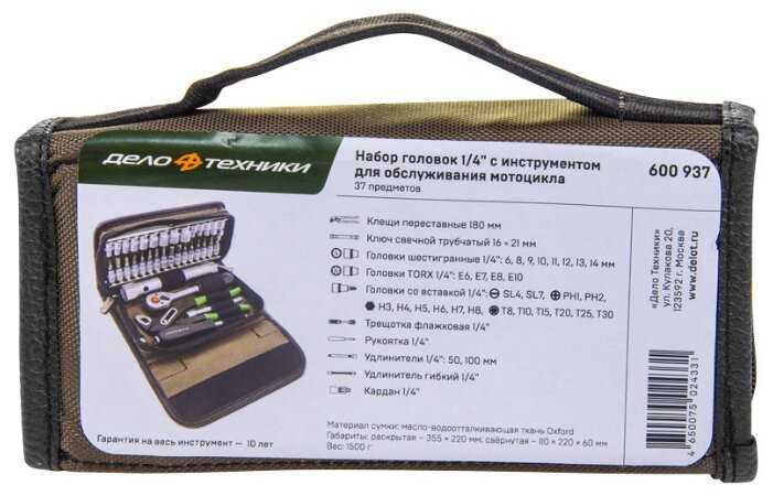 - Содержит основные головки до 14 мм, биты крестовые и шестигранные, свечной ключ и другие инструменты для обслуживания мотоцикла или авто.