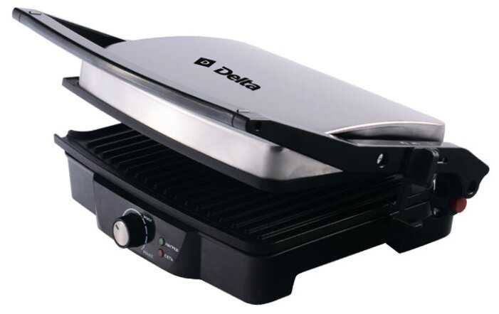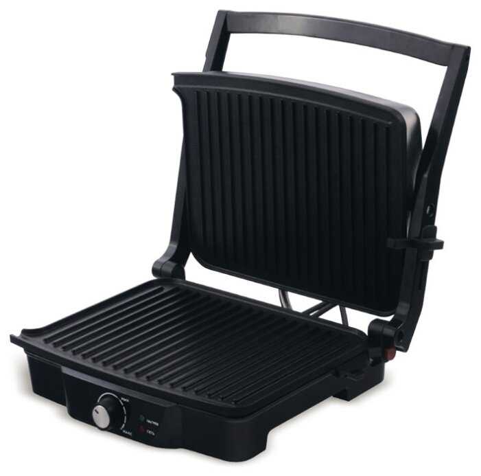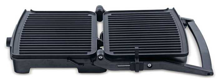 Быстро нагревается, имеет две поверхности для приготовления, открытие на 180°.