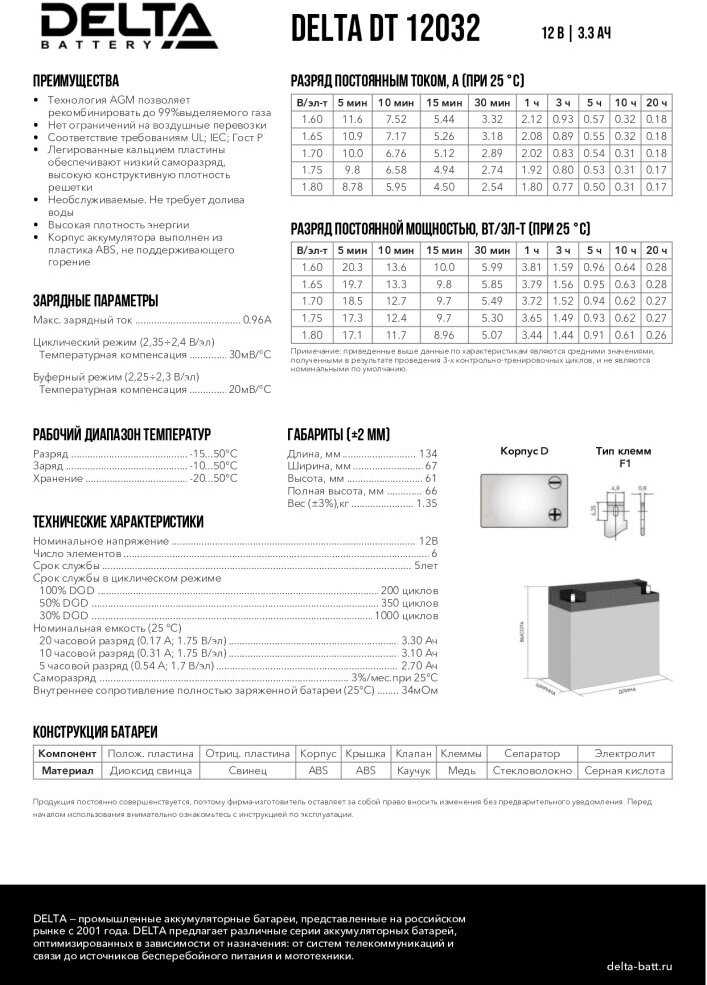 | Дополнительная информация : | Delta Аккумуляторная батарея DT 12032 (12V/3.3Ah) |