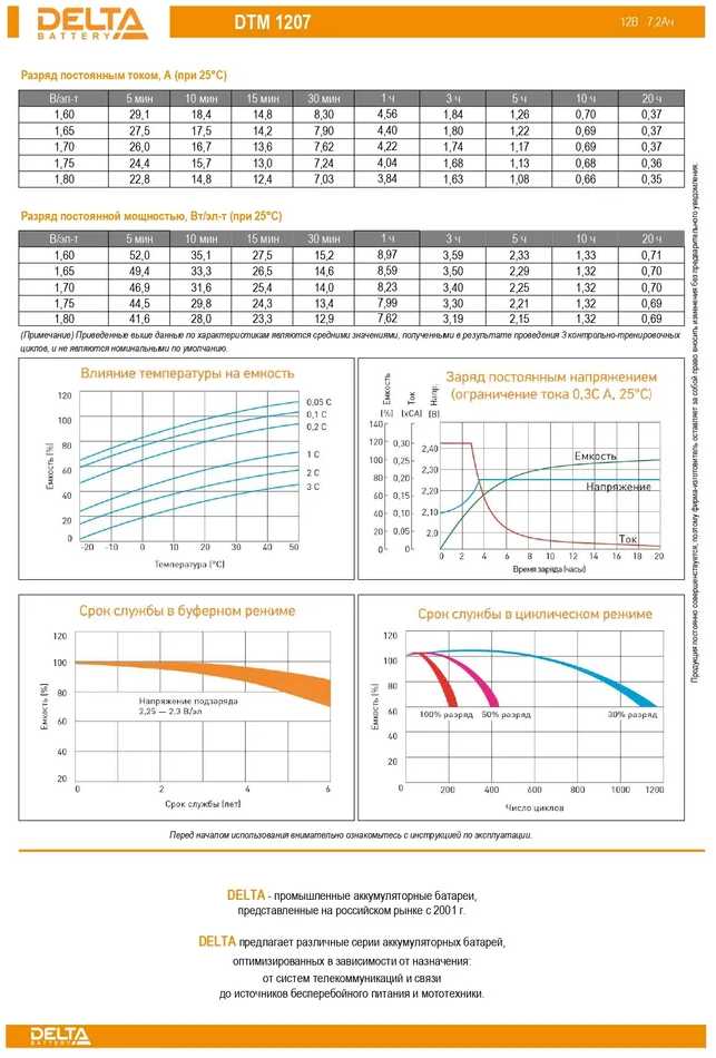 При токе разряда 12.5 А (нагрузка 150 Вт на 12 В) Delta DTM 1207 обеспечивает 2 часа 20 минут работы. Для сравнения: аналоги ёмкостью 5 Ач выдерживают не более 1 часа 10 минут при тех же условиях. -