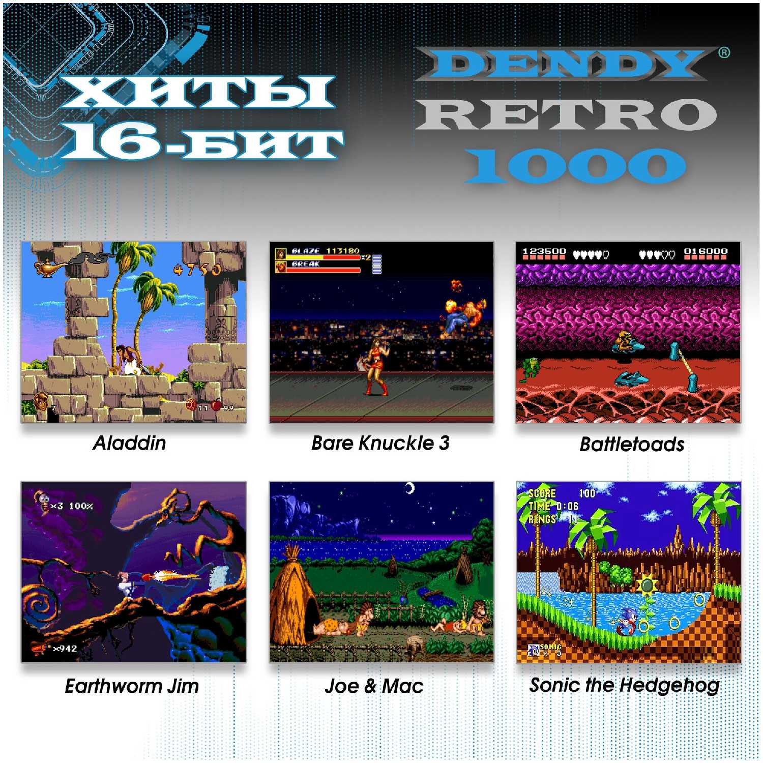 В библиотеке предустановлено 1000 игр: 425 от Dendy и 575 от Sega. Среди них классика вроде "Contra", "Super Mario", "Chip 'n Dale 2", "The Lion King", "Tanks", "Mortal Kombat" и "Aladdin". Отзывы подчеркивают разнообразие коллекции без дубликатов, характерных для старых картриджей "1000-in-1". -