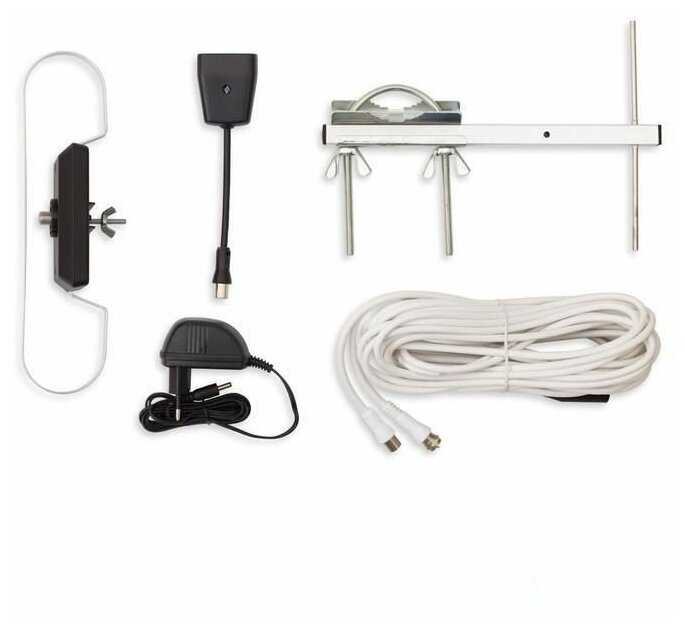 В комплекте есть сама антенна, усилитель с блоком питания, кабель 8,5 м с предустановленными F-разъёмами и кронштейн для крепления. Дополнительные покупки не требуются, но некоторые пользователи заменяли тонкий комплектный кабель на SAT-703 для дальних расстояний.