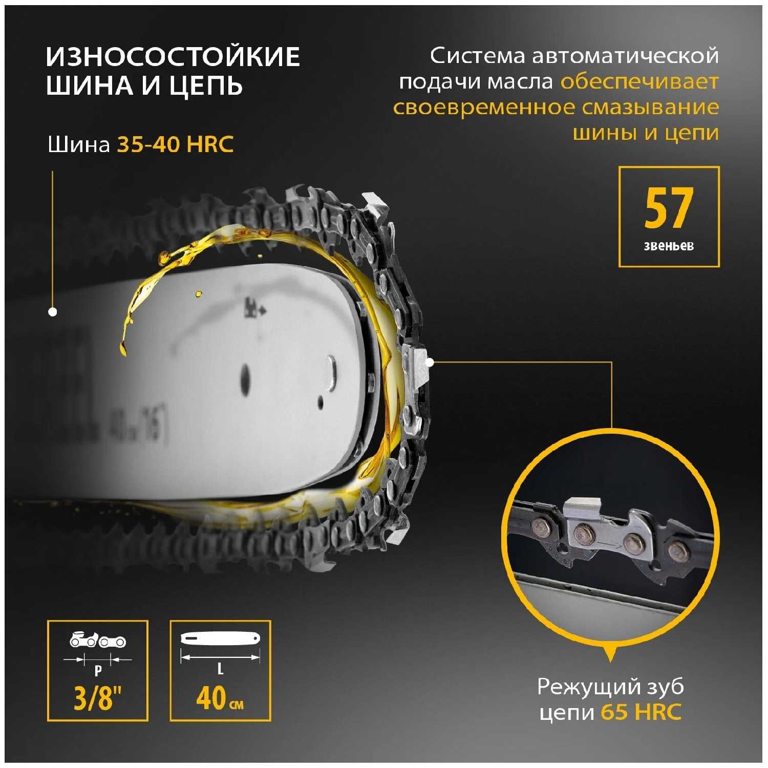 - Стальная приводная шестерня и острая заводская заточка цепи обеспечивают стабильную работу без «зажевывания».