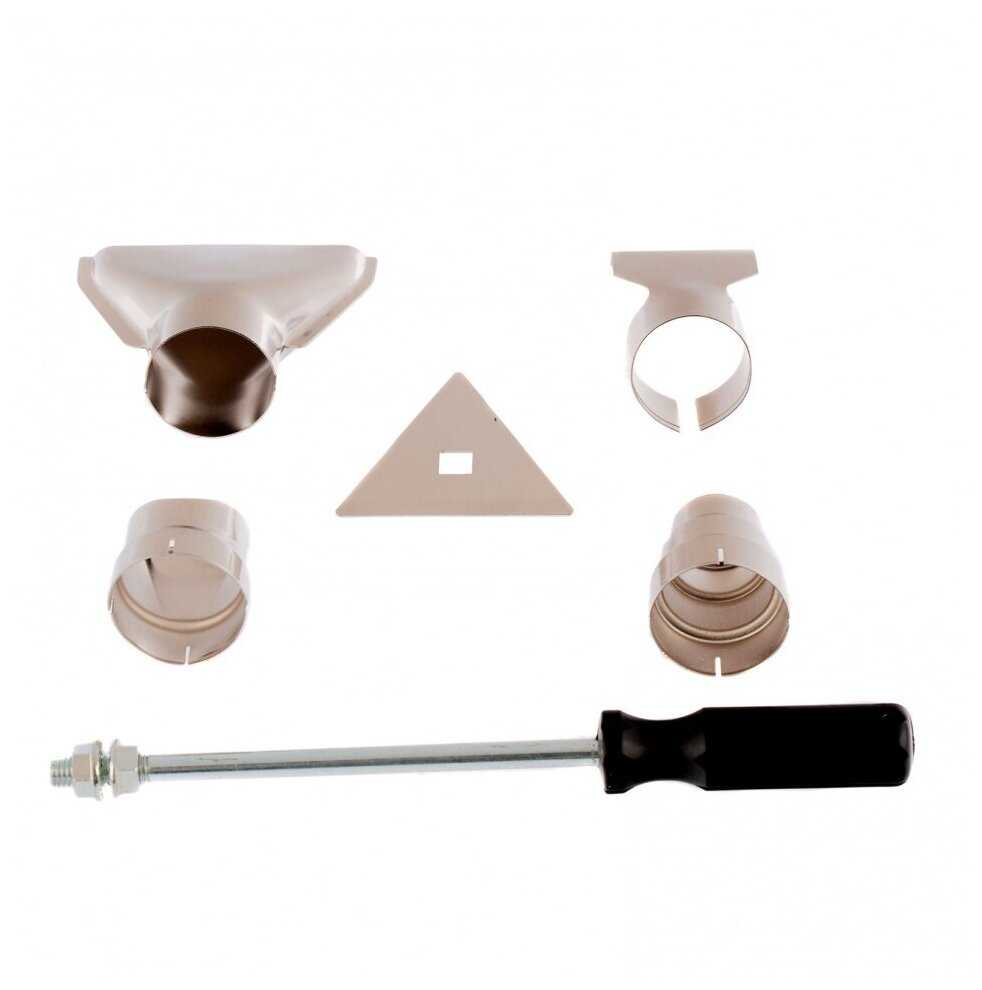 Стандартная комплектация включает четыре насадки (фокусирующую, плоскую, рефлекторную и стеклозащитную) и скребок для краски. Пользователи успешно применяли их для тонировки авто, гнутья пластика или снятия лака, но отмечают, что металл некоторых насадок тонкий — при неаккуратном использовании легко деформируется. Запросы на дополнение комплекта насадкой для пластиковых прутков встречаются в 3+ отзывах. -