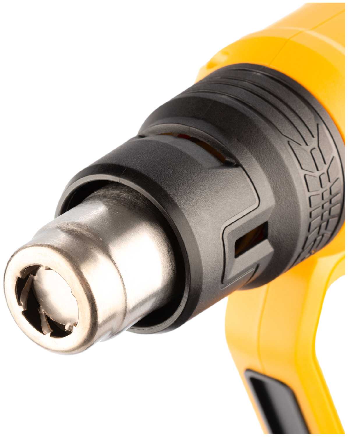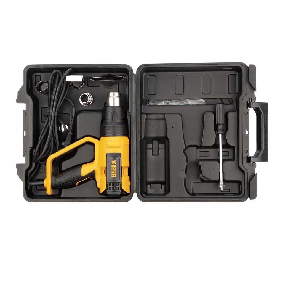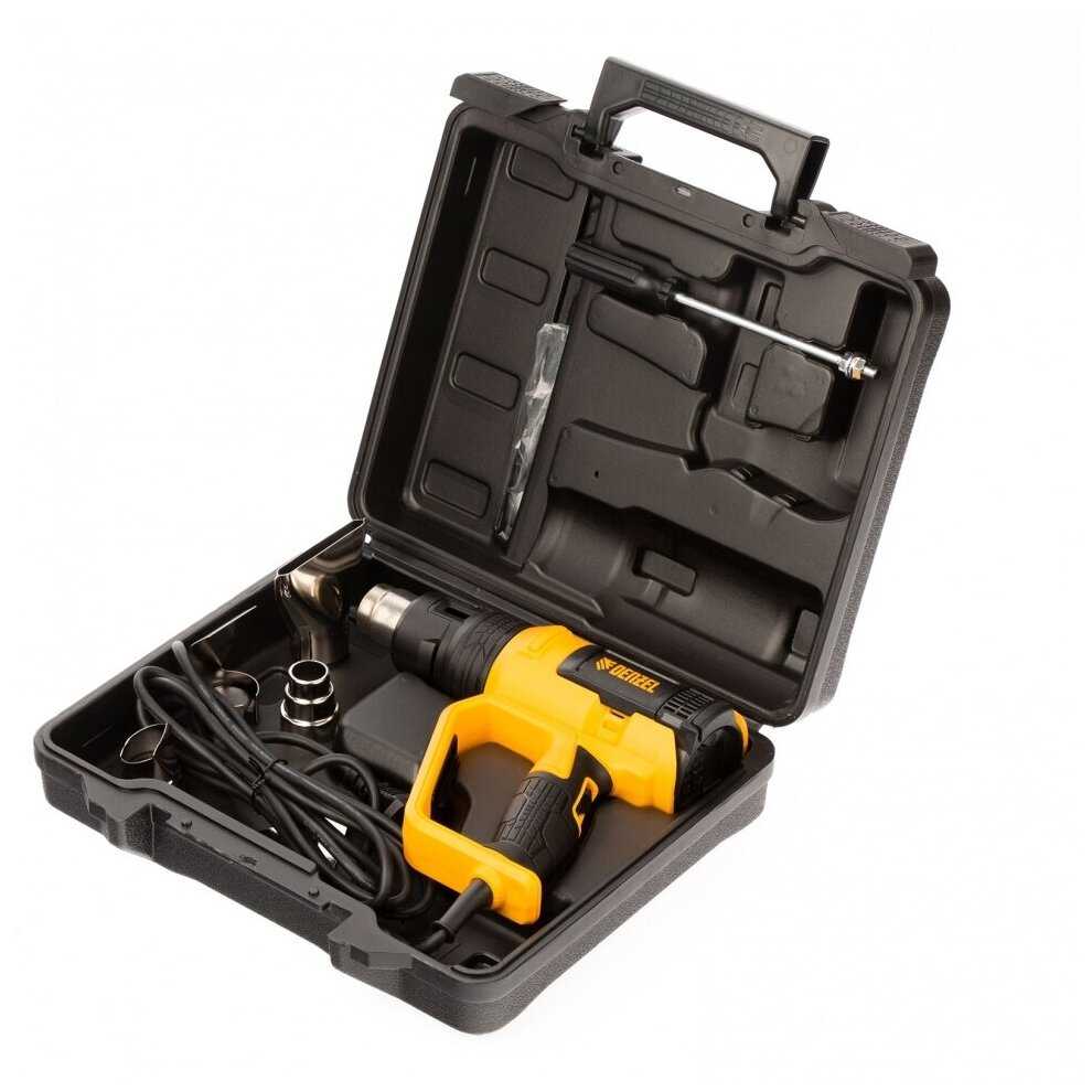 Фен получил высокие оценки за удобство в работе. Пользователи хвалят эргономичную прорезиненную рукоятку, обеспечивающую надежный и комфортный хват без скольжения даже при длительном использовании. Расположение переключателя режимов (три положения: выключено, режим продувки, режим нагрева) на задней части рукоятки под большой палец признано удачным – переключение осуществляется легко, но без случайных срабатываний. Наличие защитного "эфеса" предотвращает соскальзывание руки на горячую часть. Компактность и относительно небольшой вес также отмечены как плюсы. Комплектный пластиковый кейс удобен для хранения и транспортировки инструмента и насадок. Длинный (3 метра) и гибкий резиновый силовой кабель обеспечивает свободу перемещения. В комплект входят 4 насадки и скребок для краски, хотя их качество вызывает нарекания.