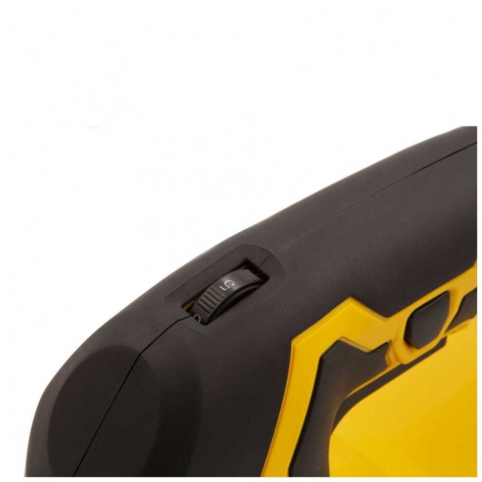 Рукоятка с резиновыми вставками и продуманный баланс снижают усталость при длительной работе. Механизм быстрой замены пилок без ключа — ключевое преимущество: пользователи отмечают, что это экономит время при частой смене материалов. Однако блокировка кнопки пуска реализована неудобно — для продолжительных работ приходится постоянно удерживать курок. Подсветка рабочей зоны и эффективный сдув опилок упрощают контроль над линией реза, но отсутствие лазерного указателя или направляющей перед лезвием усложняет точную резку для новичков.