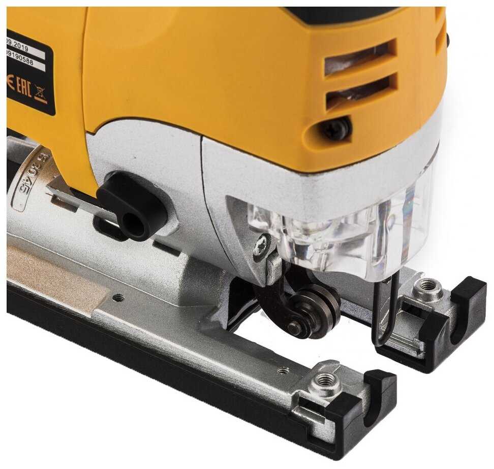 Корпус из ударопрочного пластика и литая алюминиевая подошва без люфтов — главные козыри модели. Пользователи хвалят отсутствие перекосов при резке, в отличие от предыдущих «небюджетных» лобзиков. Однако механизм зажима пилок вызывает опасения: аналогичный узел в лобзике Diolld 05 выходил из строя через год. В Denzel JS-110 крепление пилки надёжное, но из-за вибраций на высоких оборотах есть риск расшатывания. Также есть жалобы на поломку плавного пуска и регулятора оборотов после 20 циклов работы.
