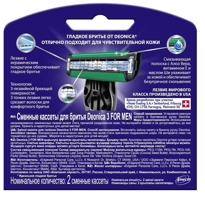 | Дополнительная информация : | лезвия сделаны в Германии, сменные кассеты Deonica For Men подходят ко всем бритвам Deonica For Men |