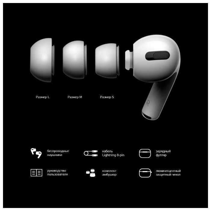 | Комплектация : | Защитный люминесцентный чехол — 1 шт. Амбушюры размера S, М и L — 6 шт. Зарядный кабель USB-Lightning — 1 шт. Беспроводные наушники — 2 шт. Зарядный кейс — 1 шт. Инструкция — 1 шт. |