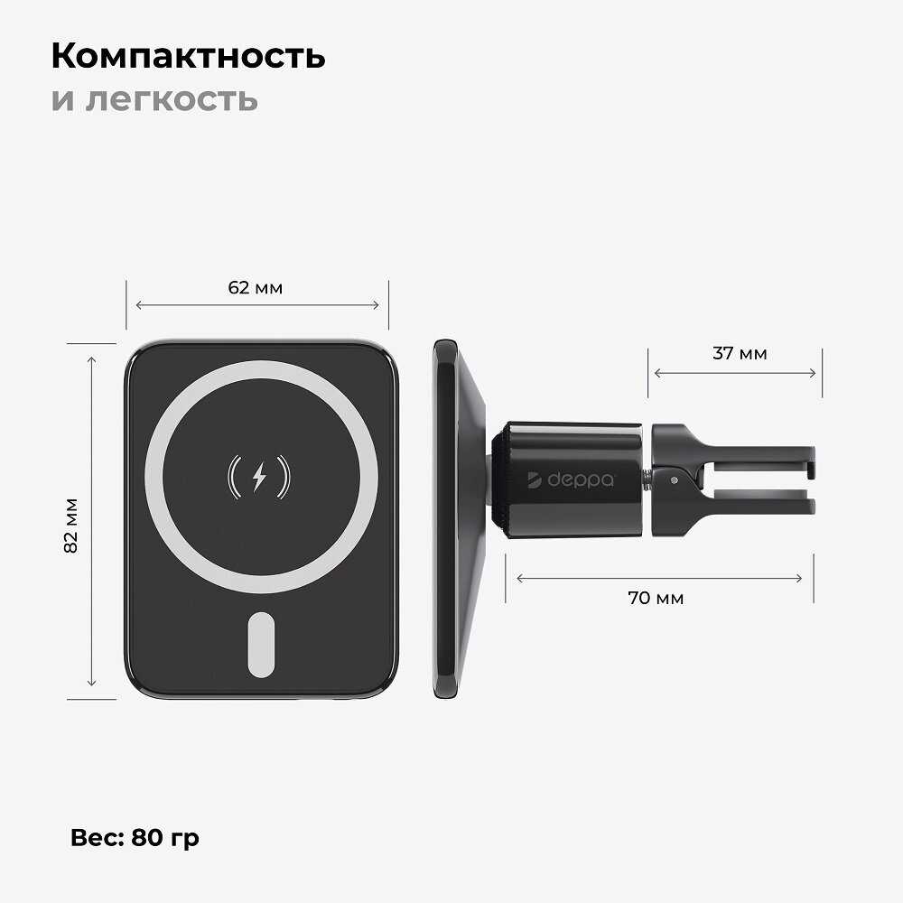 - + Магнит очень крепкий, на неровностях телефон держится, при том даже в чехле. Крепёж в воздуходув удобный, удобнее, чем простая прищепка, продумано тут хорошо. Материалы отличные, ничего не скрипит, не люфтит. Заряжает быстро, но имейте в виду - нужна автомобильная зарядка с поддержкой Power Delivery.