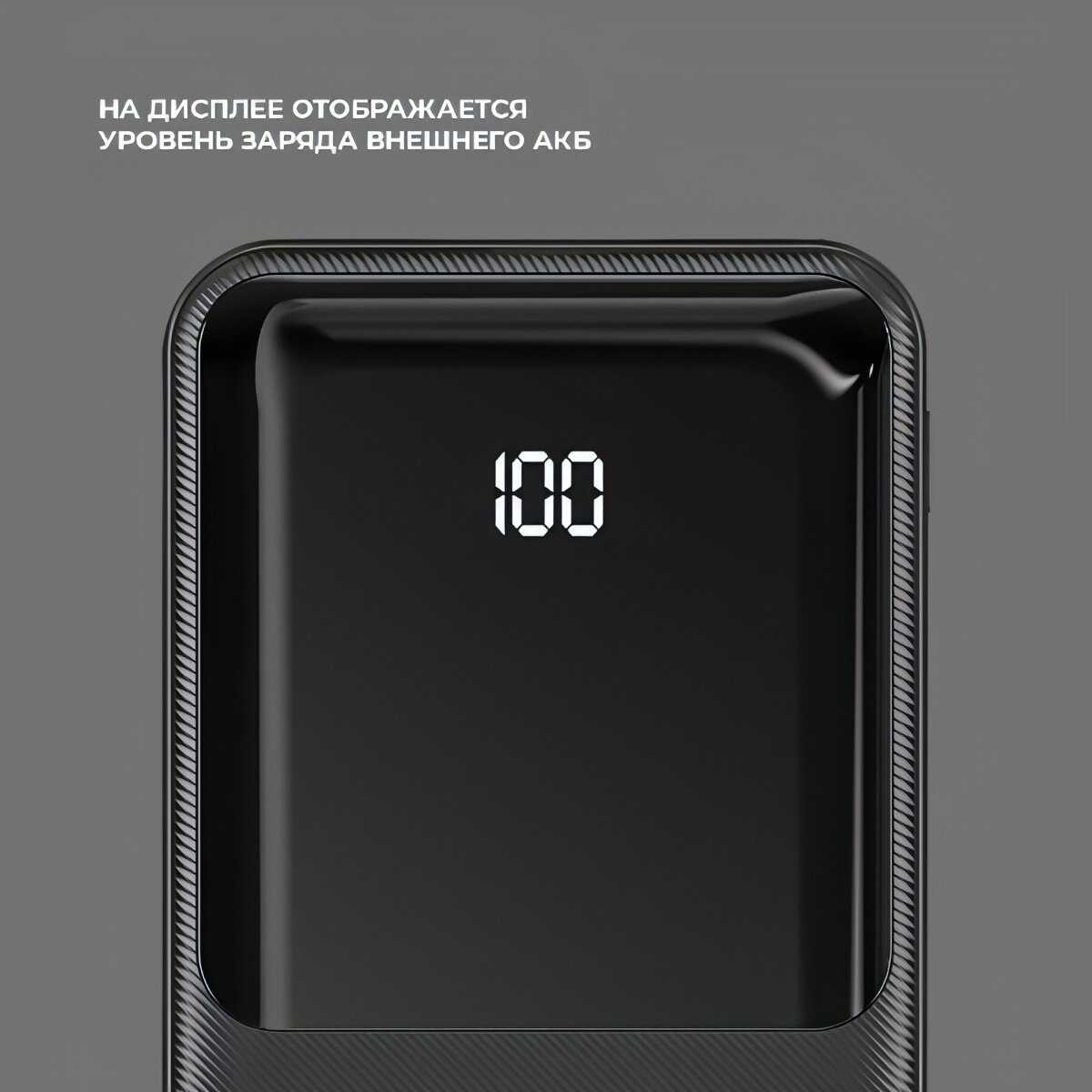 Power bank предлагает разнообразные порты, включая USB-A, Type-C и возможность подключения через встроенные кабели. Это обеспечивает совместимость практически с любыми современными гаджетами — смартфонами, планшетами, наушниками и умными часами.