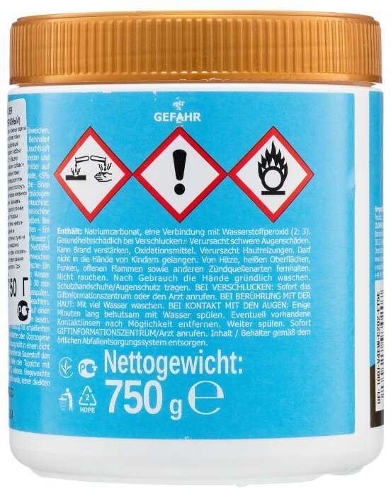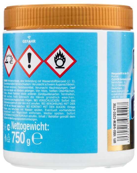 | Дополнительная информация : | >30% - кислородсодержащий отбеливатель, <5% - анионные и неионогенные ПАВ, фосфонаты, оптический отбеливатель, энзимы. Содержит: карбонат натрия, перекись водорода. |