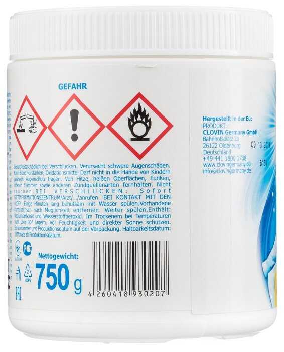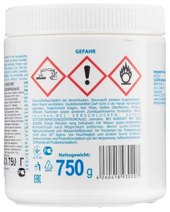 - Может реагировать с некоторыми металлами в стиральной машине, вызывая пятна на тканях при неправильном использовании.