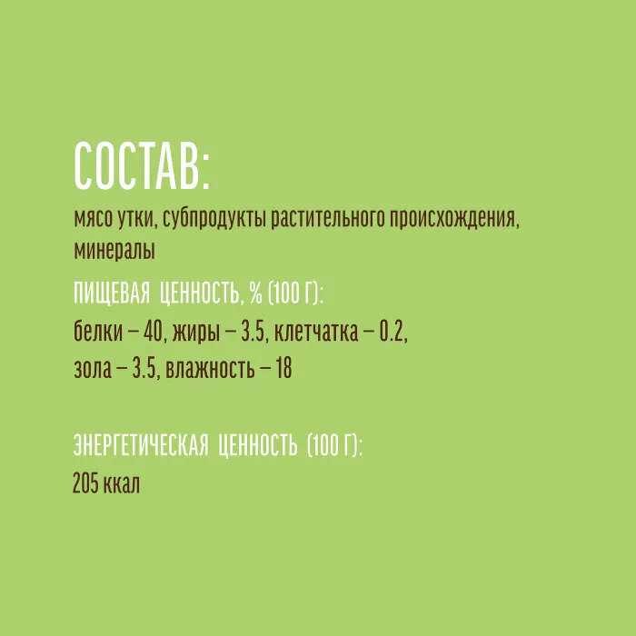 - Основной ингредиент — утиная грудка — является источником чистого белка без искусственных добавок.