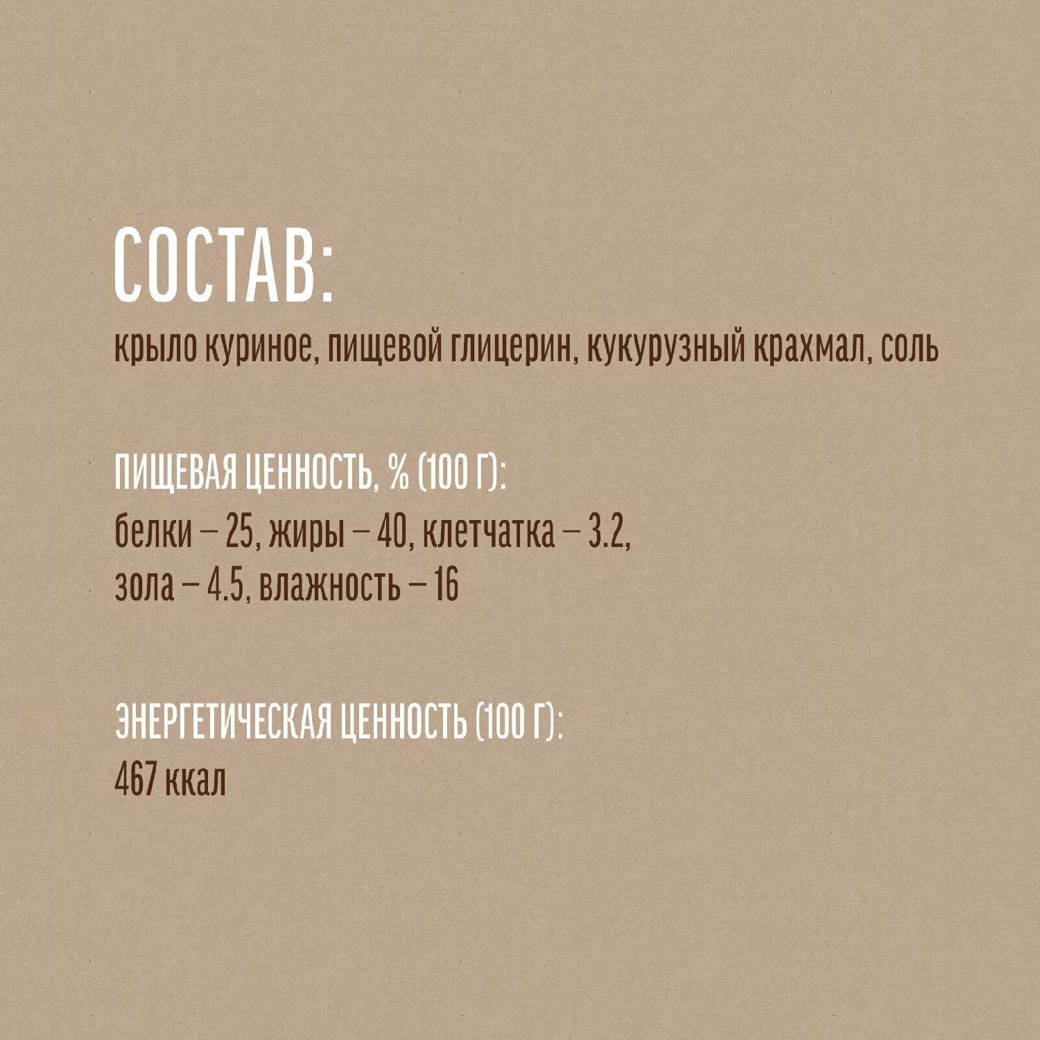 Состав : | крыло куриное, пищевой глицерин, кукурузный крахмал, соль |