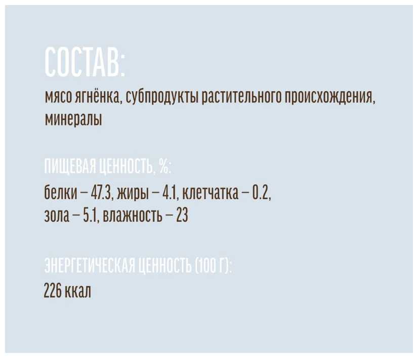 | Состав : | мясо ягненка, субпродукты растительного происхождения, минералы |