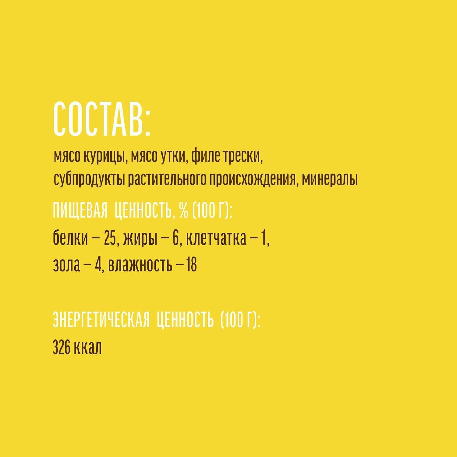 Состав : | мясо курицы, мясо утки, филе трески, субпродукты растительного происхождения, минералы |