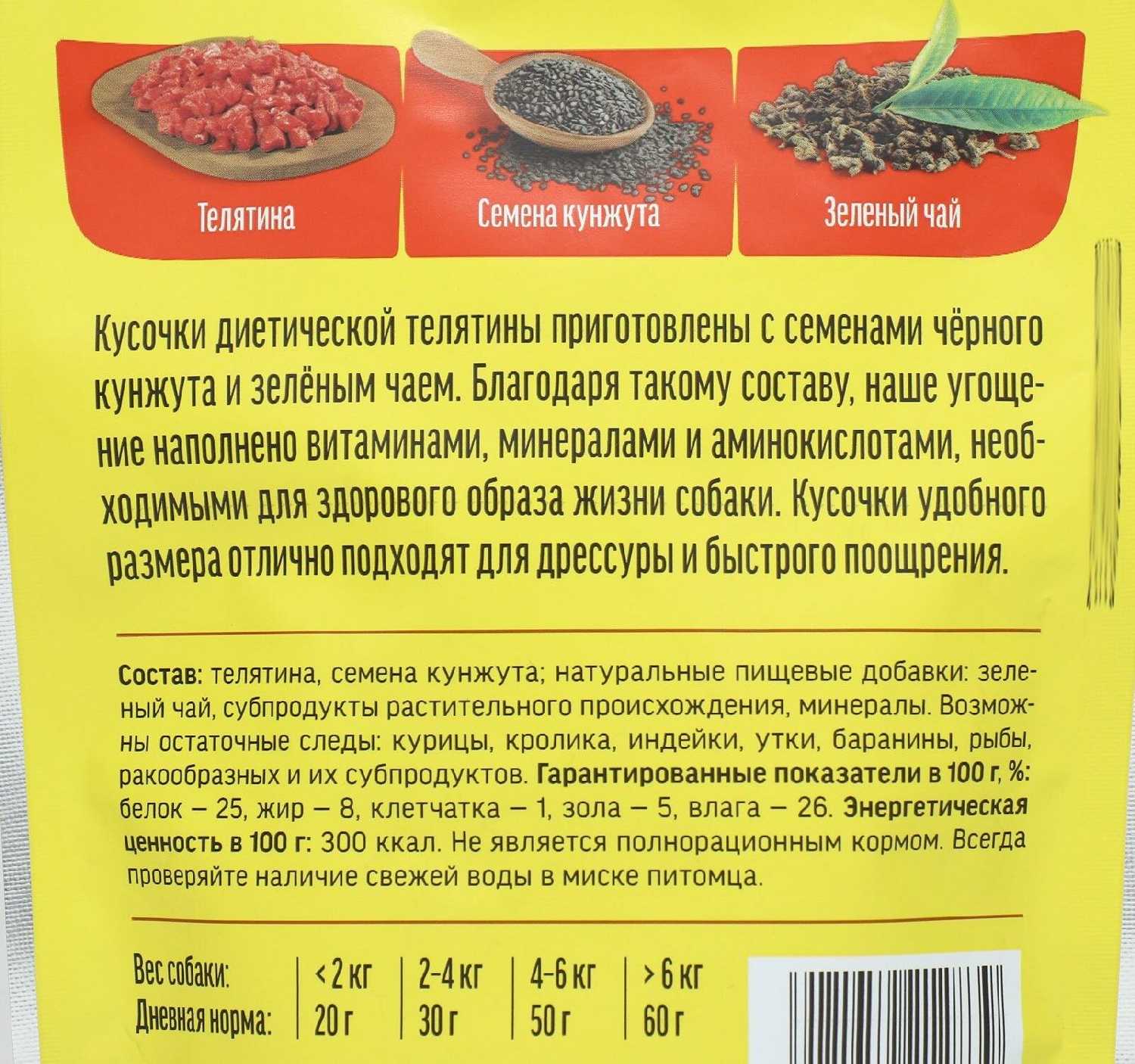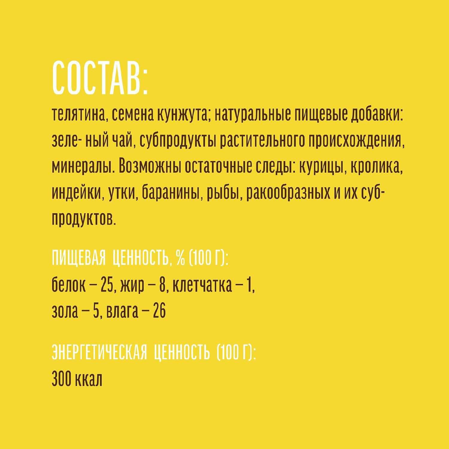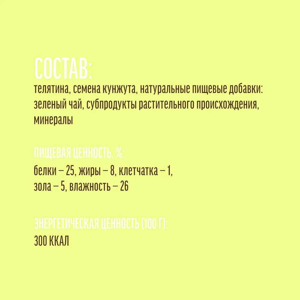 Состав : | телятина смена кунжута, натуральные пищевые добавки: крахмал зелёный чай пищевой глицерин растительный протеин сорбит соль |