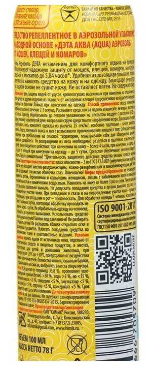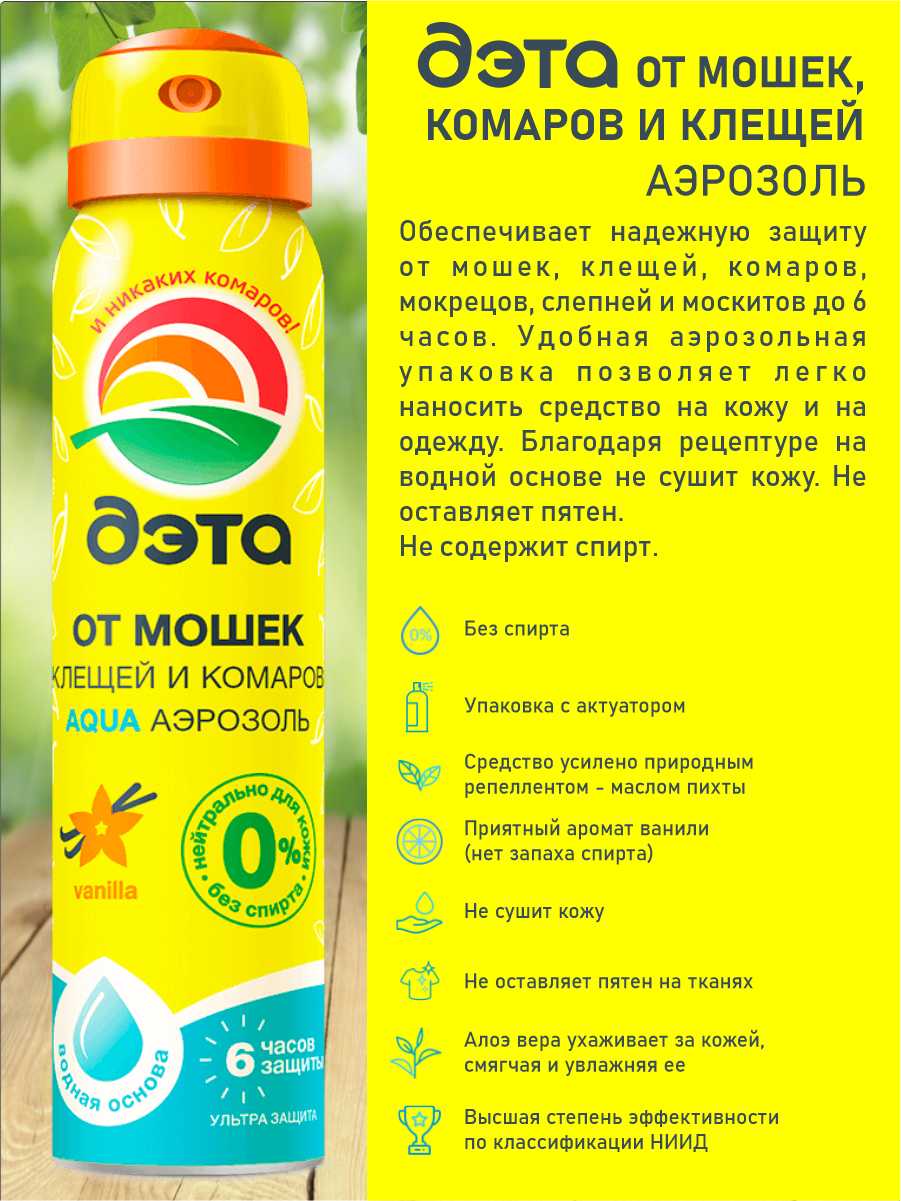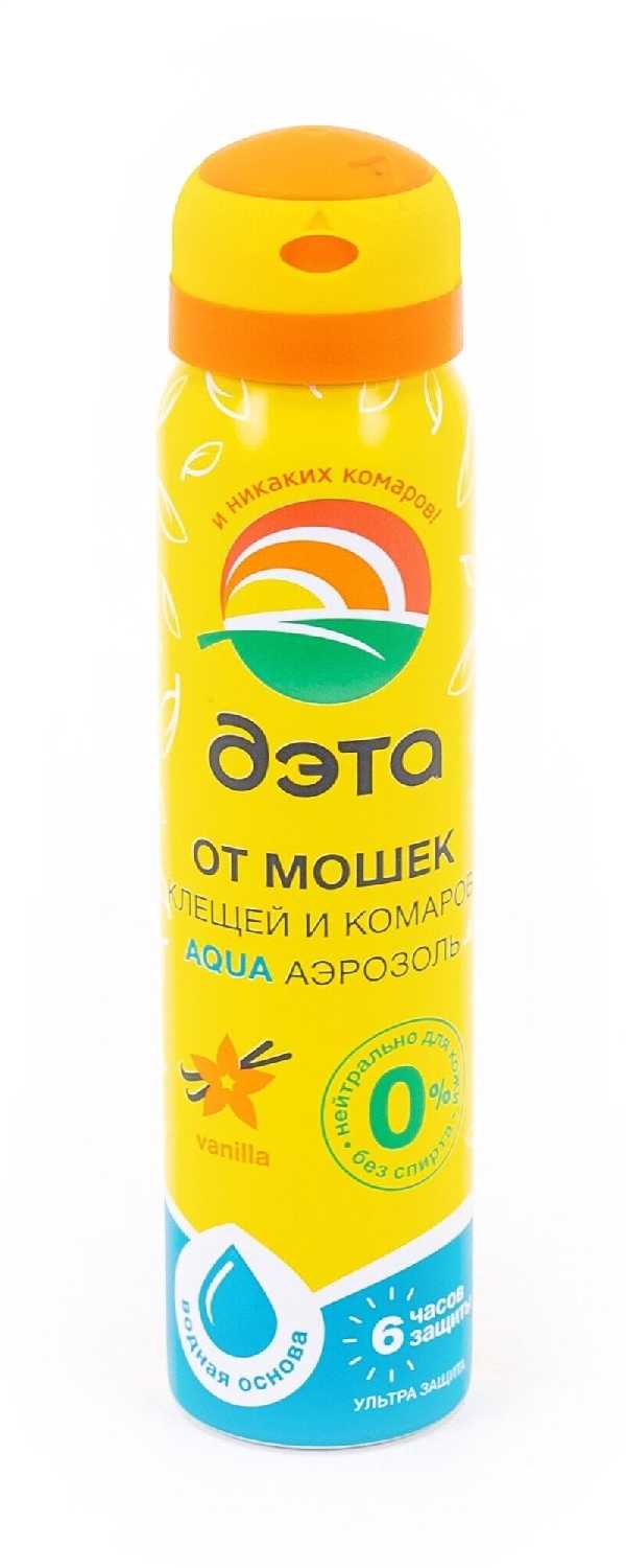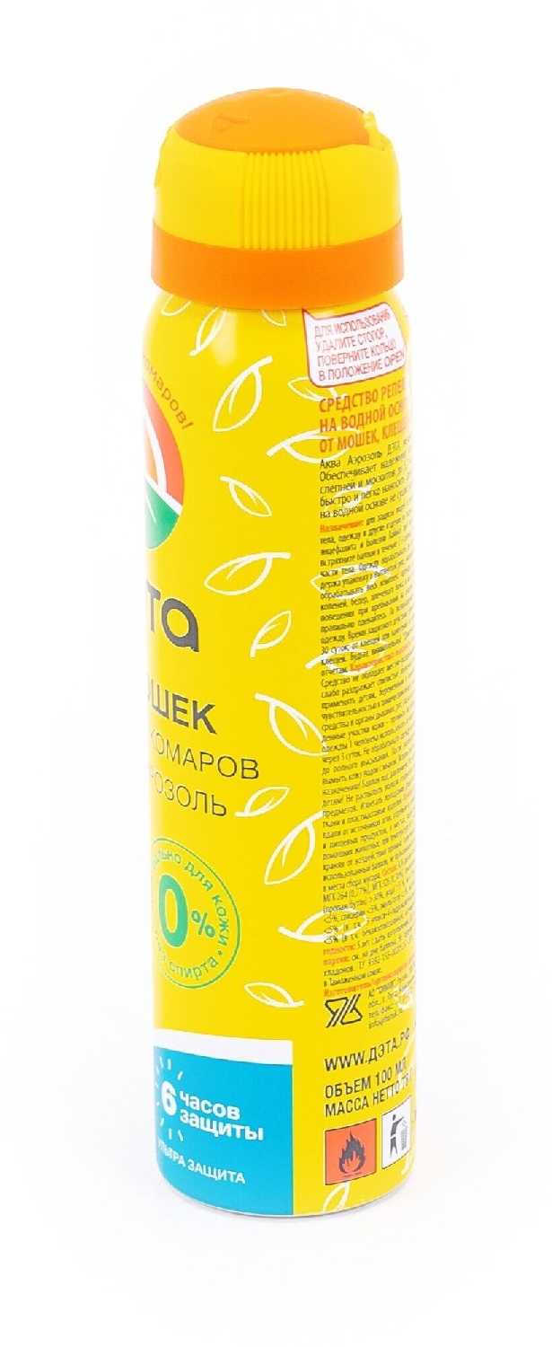 | Подробная комплектация : | Средство от мошек, клещей и комаров, аэрозоль ДЭТА АКВА, 100 мл 1шт |