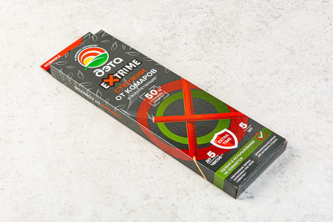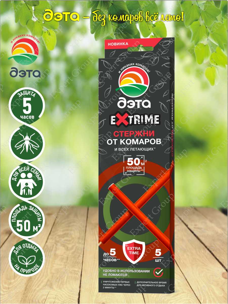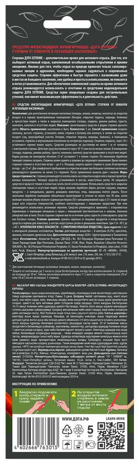| Подробная комплектация : | Стрежни от комаров и летающих насекомых ДЭТА EXTRIME, 5 шт. в упаковке - 1 шт. |