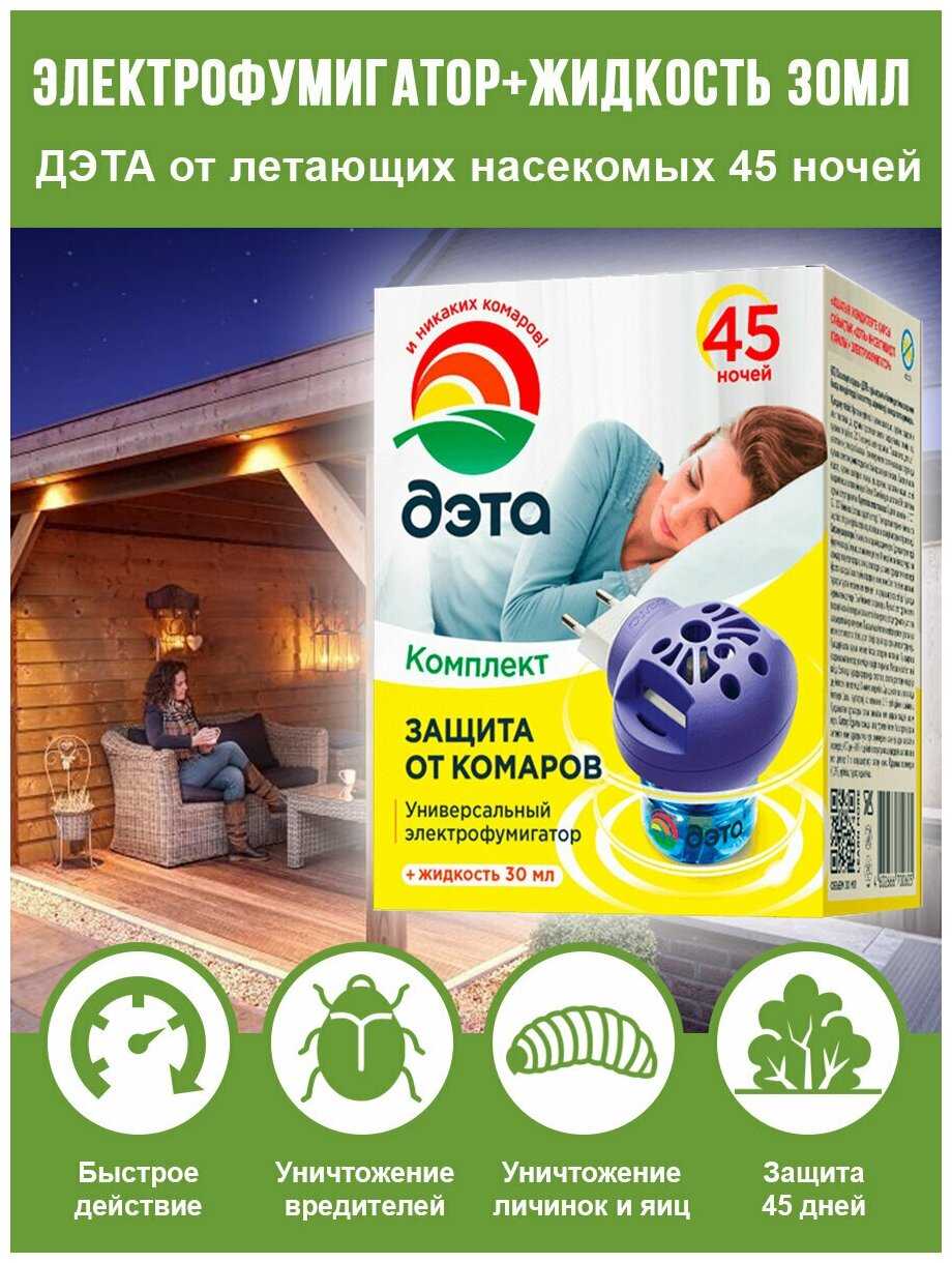 | Подробная комплектация : | Дэта Комплект Фумигатор + Жидкость 45 ночей, 30 мл - 1 шт |