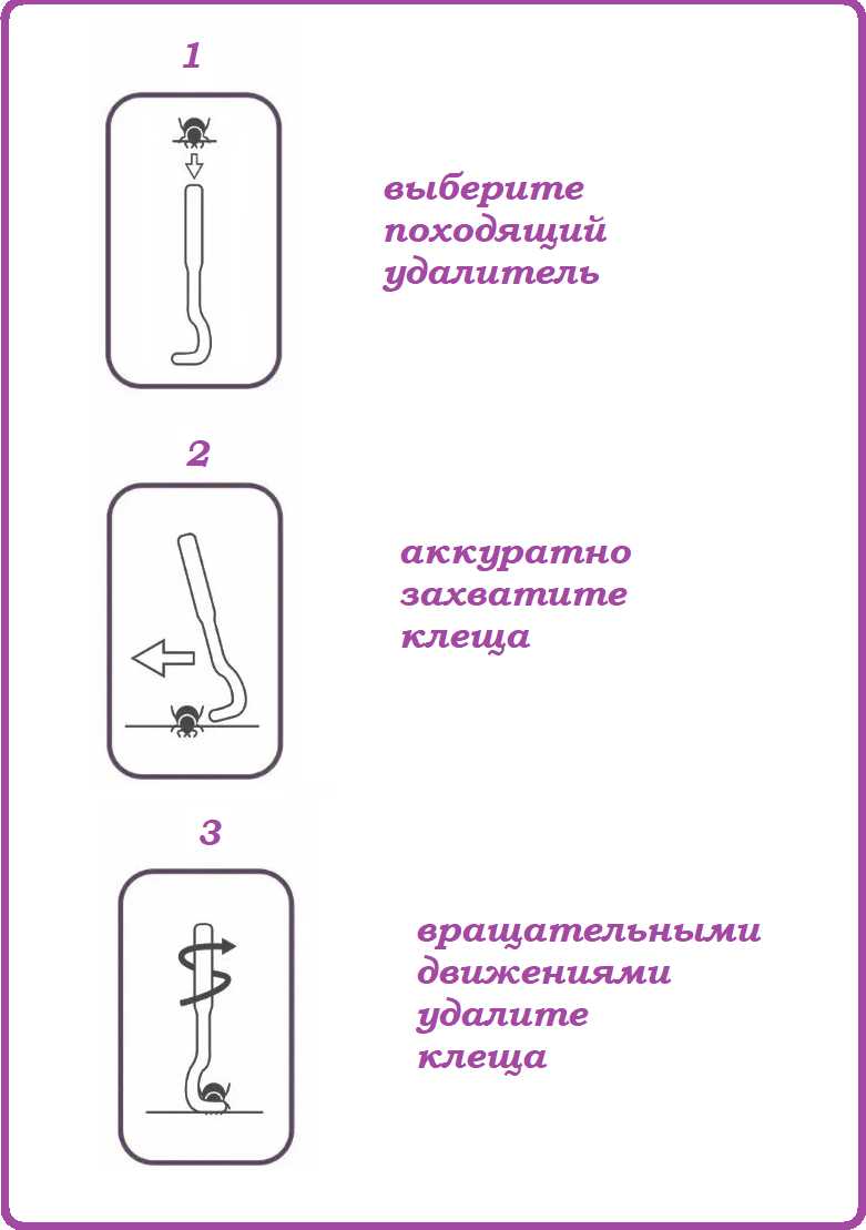 Способ применения : | Выберите подходящий удалитель в зависимости от размера клеща. Аккуратно заведите развилку удалителя под клещ Слегка приподнимая удалитель, сделайте 2-3 круговых вращения до полного извлечения клеща. После удаления клеща рекомендуется продезинфицировать место укуса. |
