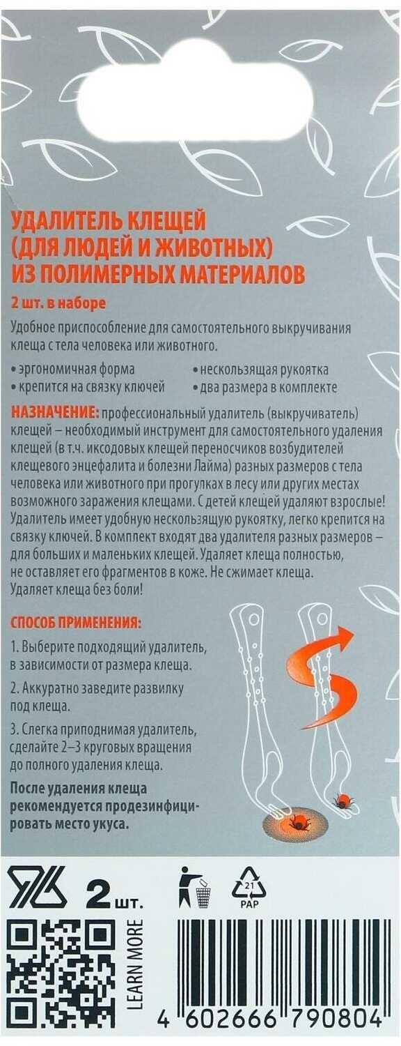 Подробная комплектация : | 2 устройства для удаления клещей |