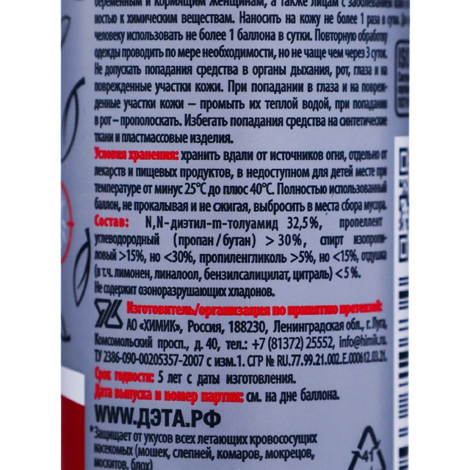 | Дополнительная информация : | действует от летающих насекомых до 5 часов, от клещей до 5 суток при нанесении на одежду |