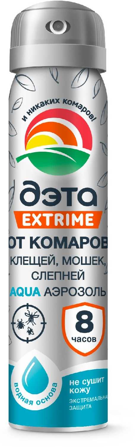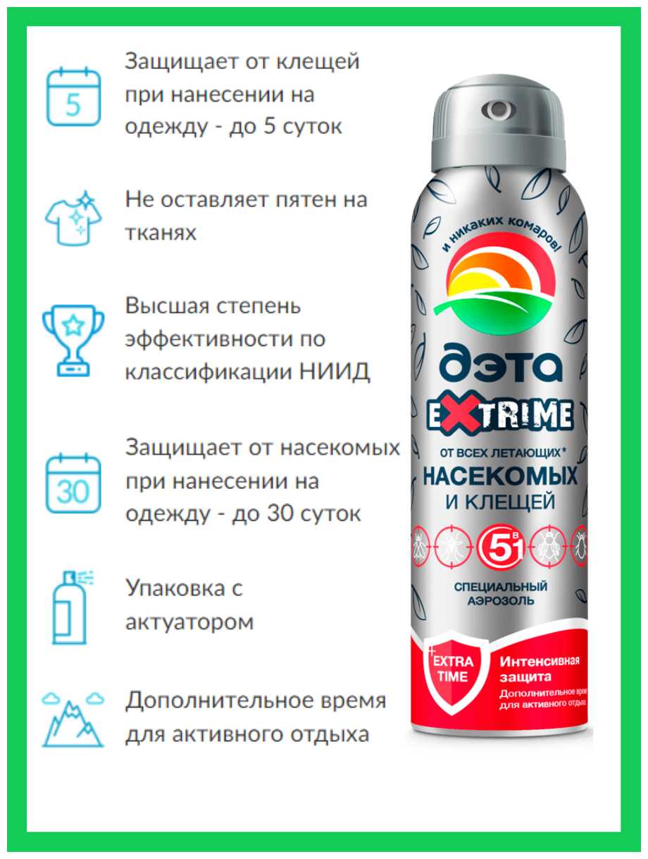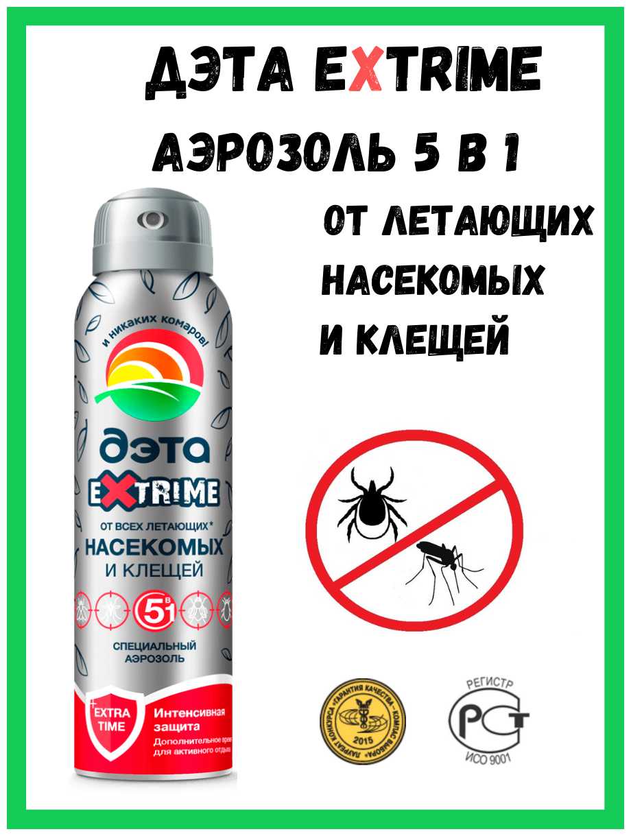 Подробная комплектация : | Аэрозоль Экстрим 5 в 1 от комаров, слепней, блох, мошек, мокрецов, москитов и иксодовых клещей, репеллент ДЭТА, 150мл - 1 шт. |
