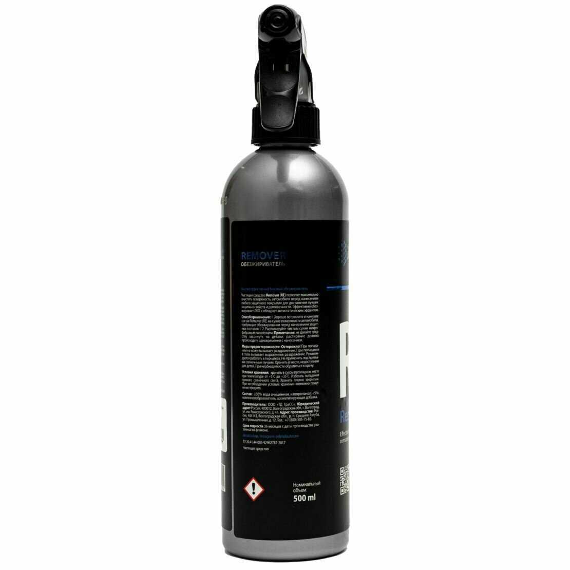 | Способ применения : | хорошо встряхните флакон и нанесите состав Remover (RE) на сухие поверхности автомобиля требующие обезжиривания перед нанесением защитных составов., Располируйте чистым сухим микрофибровым полотенцем Примечание: не давайте средству засохнуть на детали: растирание должно происходить одновременно с нанесением. |
