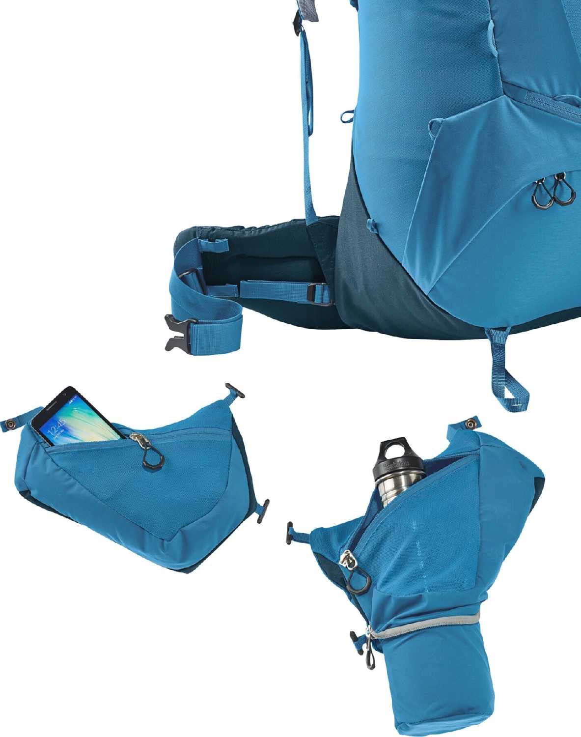 Два боковых кармана на поясе, один из которых можно удлинить под бутылку - супер удобно !