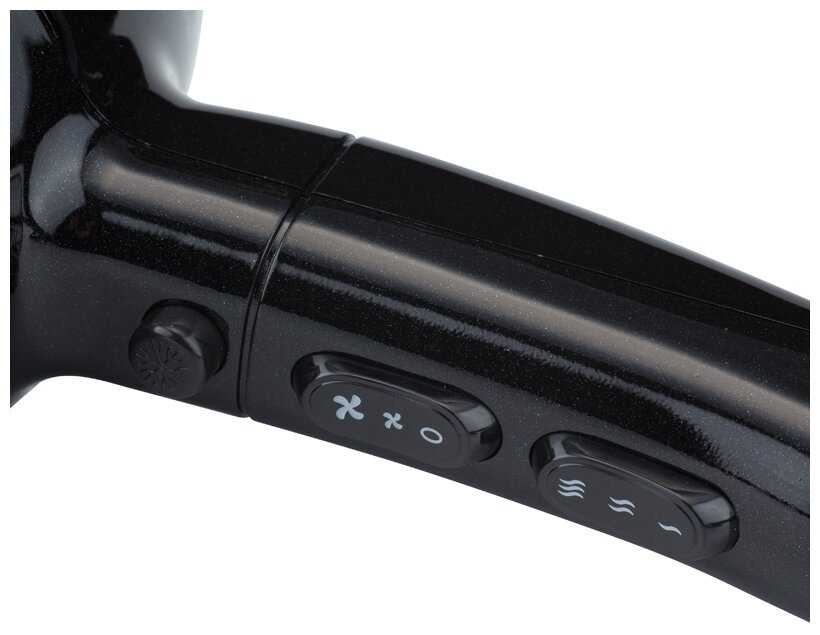 - Три уровня температуры (холодный, теплый, горячий) и две скорости потока позволяют адаптировать под тип волос, избегая повреждений тонких прядей.