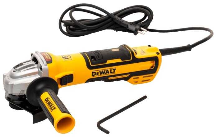 - + DEWALT DWE4357-QS 448FE на мой взгляд является вне конкуренции в своём классе. Безщёточный двигатель, огромная мощность при таких размерах, ручка удобная, кожух быстросъёмный, гайка прижимная затягивается без всяких ключей от руки, защита при подаче питания и включеной кнопке (если пропал свет, и забыли выключить кнопку, при этом потом снова воткнули в розетку, болгарка не запустится, будет светиться индикатор красного цвета, зелёный индикатор показывающий наличие питания от сети, защита от заклинивания диска и ударов, тормоз двигателя, поддержка оборотов при неравномерном отборе мощности на валу, малый вес для такой мощи, и шнурок не пожалели, длинны хватает с головой.
